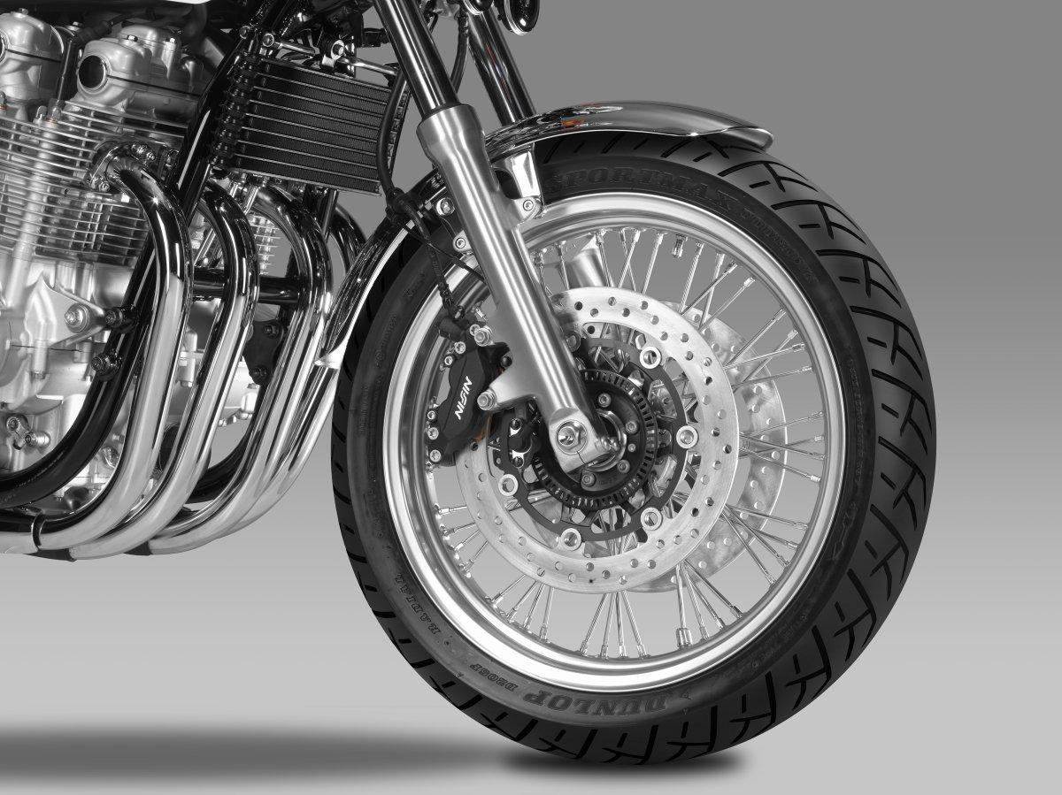 Getragen wird die vollgetankt immerhin 248 Kilogramm schwere CB1100 von schmalen 18-Zoll-Rädern, vorne 110er und hinten 140er. Auch dies ermöglicht gewiss ein angesichts des hohen Gewichtes leichtes Handling insbesondere in Kurvenlagen. Hier bestimmen lediglich die ansonsten perfekt positionierten Fußrasten den maximalen Winkel. Manchem jedoch wird beim Blick auf die Räder ein Stilbruch auffallen. Puristen könnten daran bemängeln, dass die Streben aus Leichtmetallguss ein wenig den Gesamteindruck stören. Dies ist ein Wermutstropfen, der wohl auch den Ingenieuren von Honda aufgefallen ist.