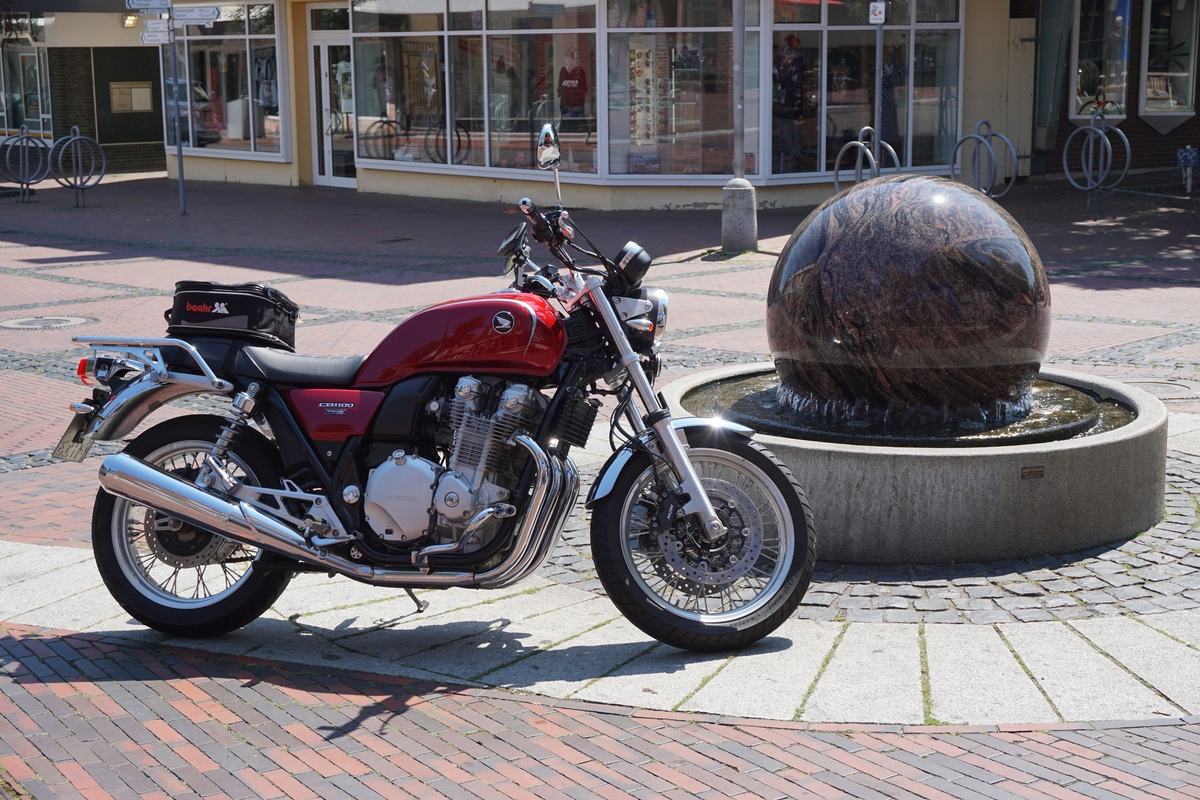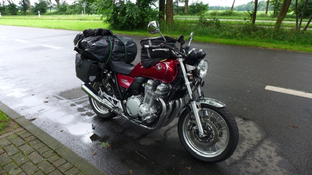 Die Befestigung ist so, dass sie wie bei einem Pferd auf der Sitzbank liegen und mit Zusatzriemen fixiert werden. Den Honda-Träger habe ich eigentlich vor allem wegen der Optik