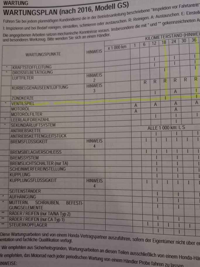 12000km Intervall für das Ventilspiel steht bei den Wartungsplänen für: