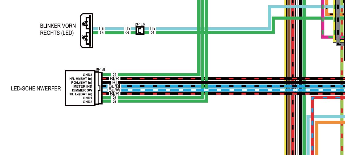 Hinweise zur Honda Kabelbelegeung (Farbcode) am werksseitigen Kabelbaum folgen in einem weiteren Beitrag. Honda Deutschland hat mir nach einigem Hin und Her einen Schaltplan als pdf zur Verfügung gestellt und zugleich hat ein sehr langjähriger Ingenieur dort eingeräumt, aus diesem Schaltplan in Bezug auf den Scheinwerfer und den dort verbauten 8pol Stecker nicht schlau zu werden.