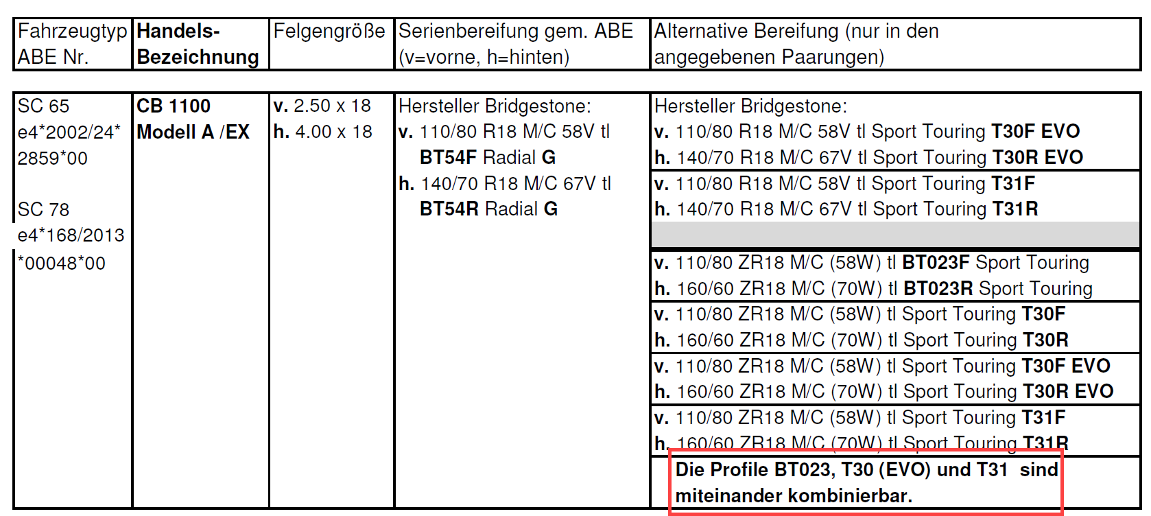 da keine Reifen- und/oder Fabrikatsbindung in den Papieren der CB1100 steht, müßte ich doch eigentlich noch nicht mal eine Reifenfreigabe des Reifenherstellers benötigen (und mitführen müssen)!?...stimmt, die SC78 ist auch nicht mehr überall gelistet.