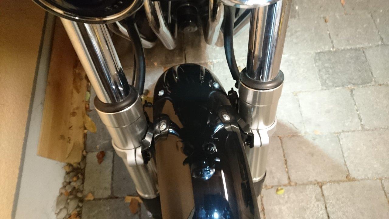 - besaß eine meines Erachtens eine für das Gewicht des Motorrads nicht voll überzeugend stabile Gabelstabilisation in Form des Kotflügelträgers aus 2mm Stahlblech.