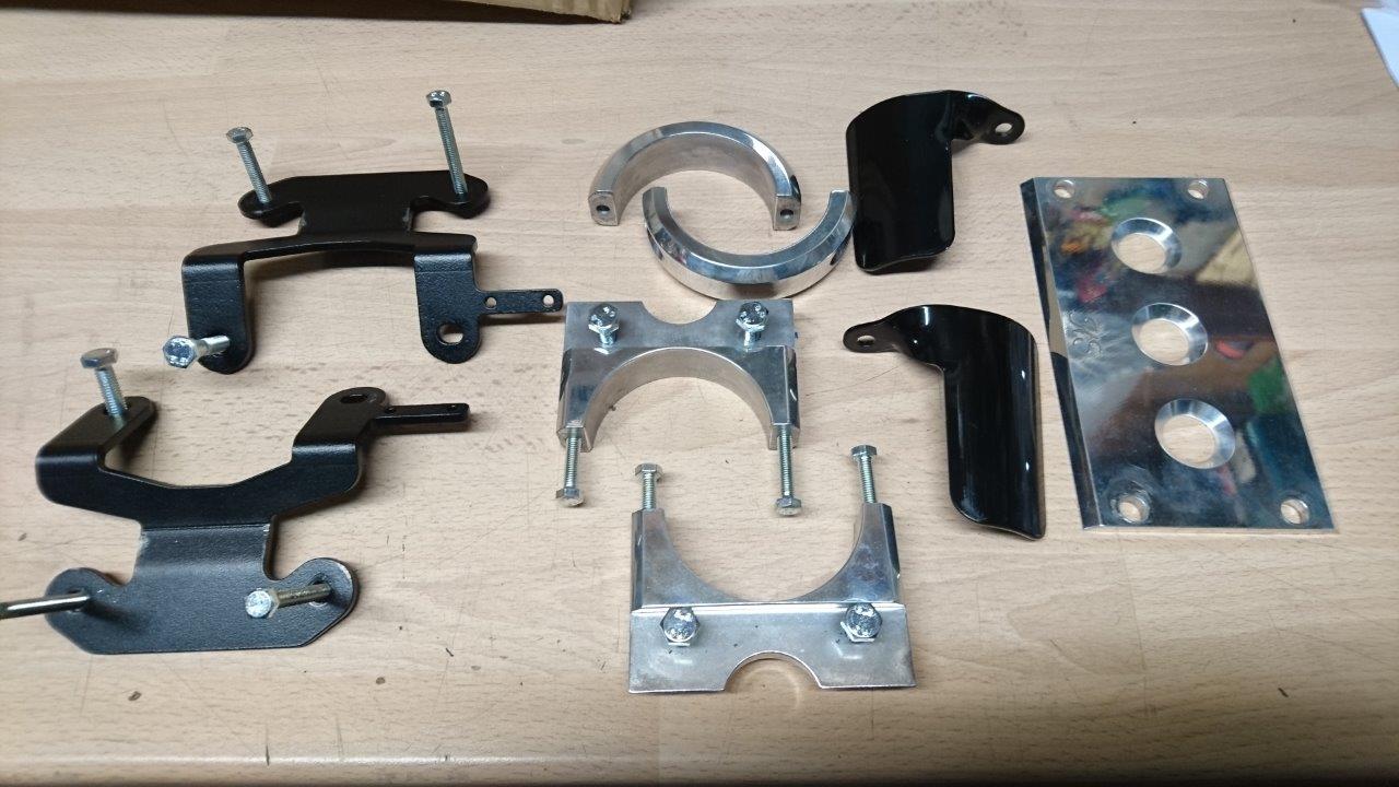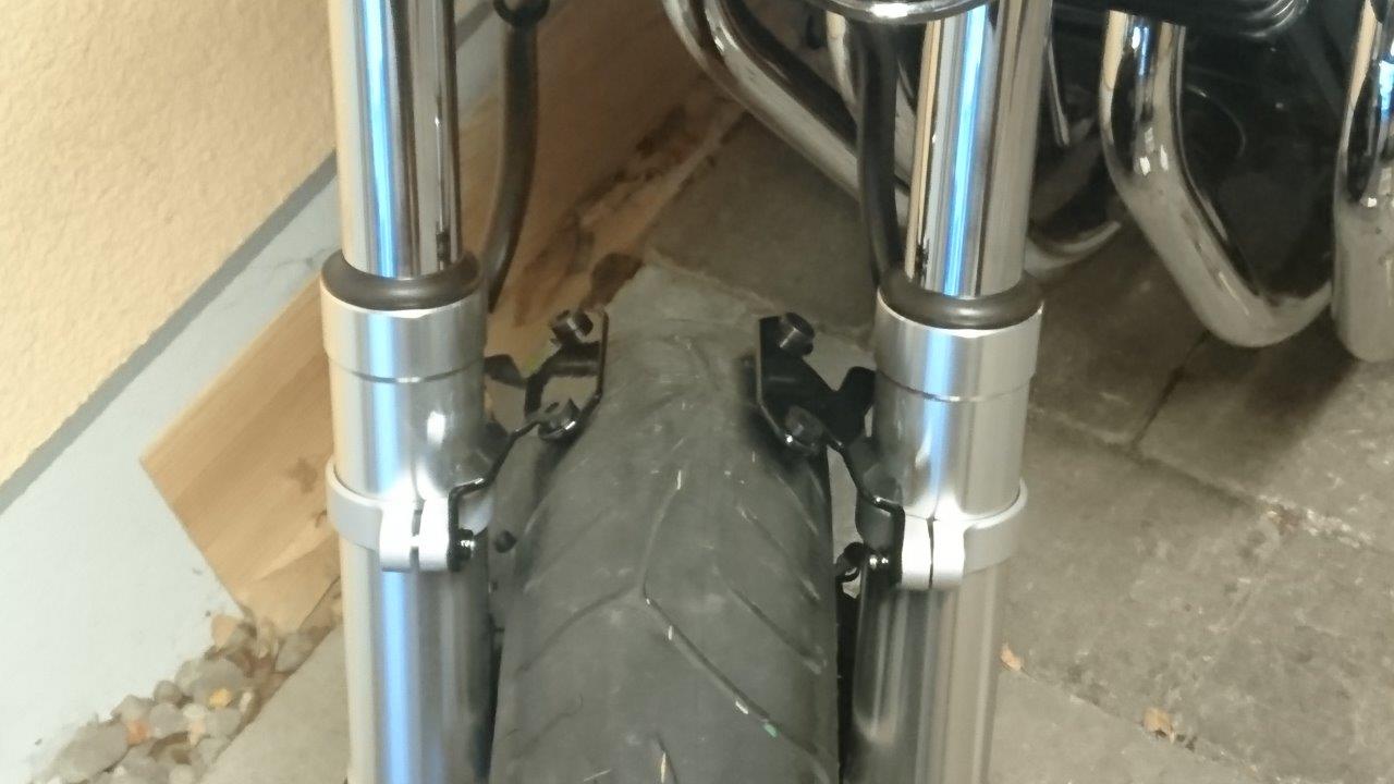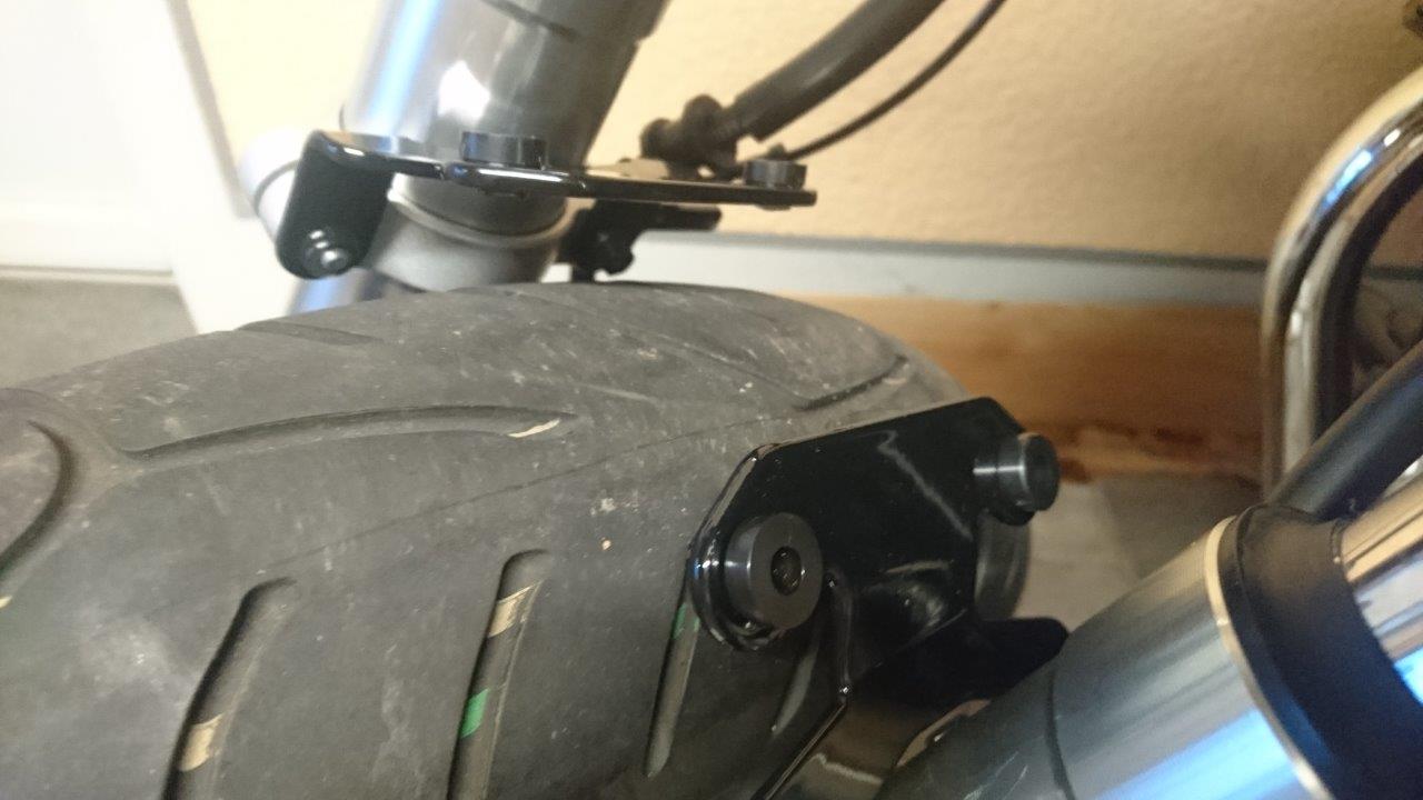 5. Gabelstabilisator von Kern-Stabi besorgt. Die SW Motech Träger bilden keinen geschlossenen Bogen und die Sache wäre erst dann ok, wenn das Blech mindestens 2mm stark wäre. Ist es aber nicht, sondern lediglich 1,5mm, was sich für einen Kotflügel an sich recht stabil anfühlt - aber eben nicht als Gabelstabi hinreicht.
