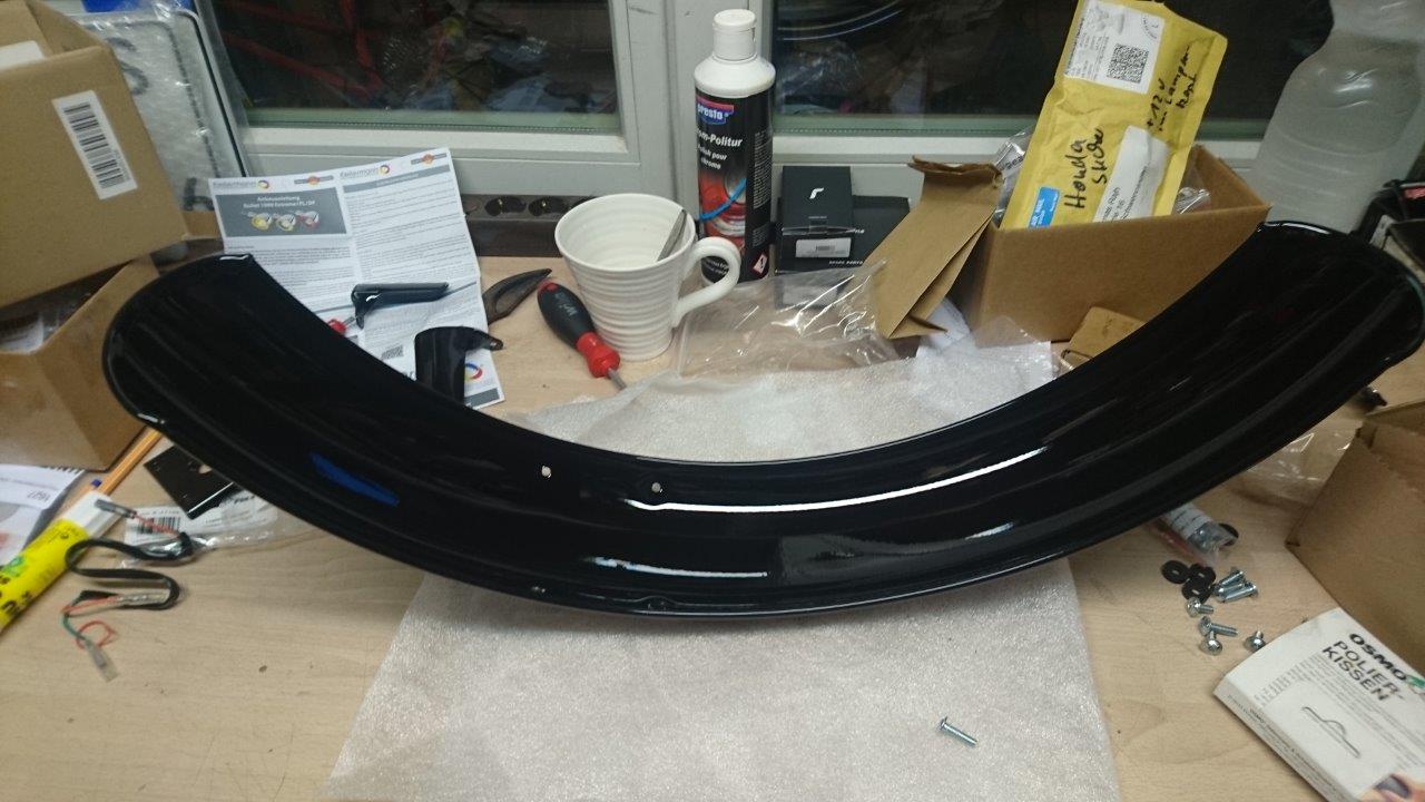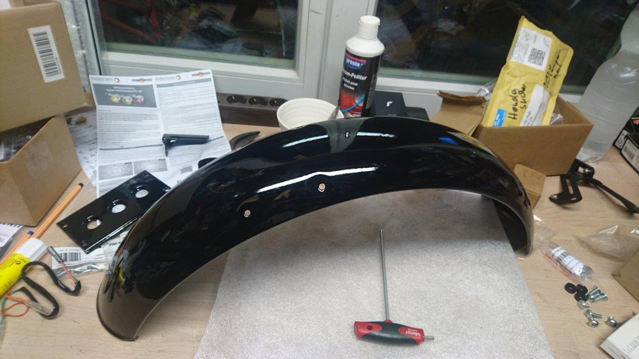 Alle Teile habe ich in schwarz seidenmatt hier vor Ort (pulver-)beschichten lassen, den Kotflügel zusätzlich klar lackieren lassen.