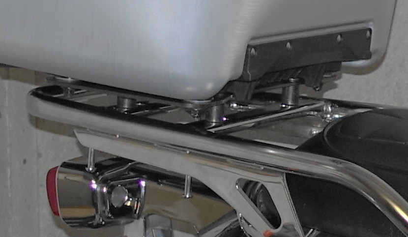 Da die Kiste überhängend ist an der Grundplatte und das Ding nicht schlüssig auf die konische Form des Gepäckträgers passt kamen Distanzhülsen zum Einsatz -