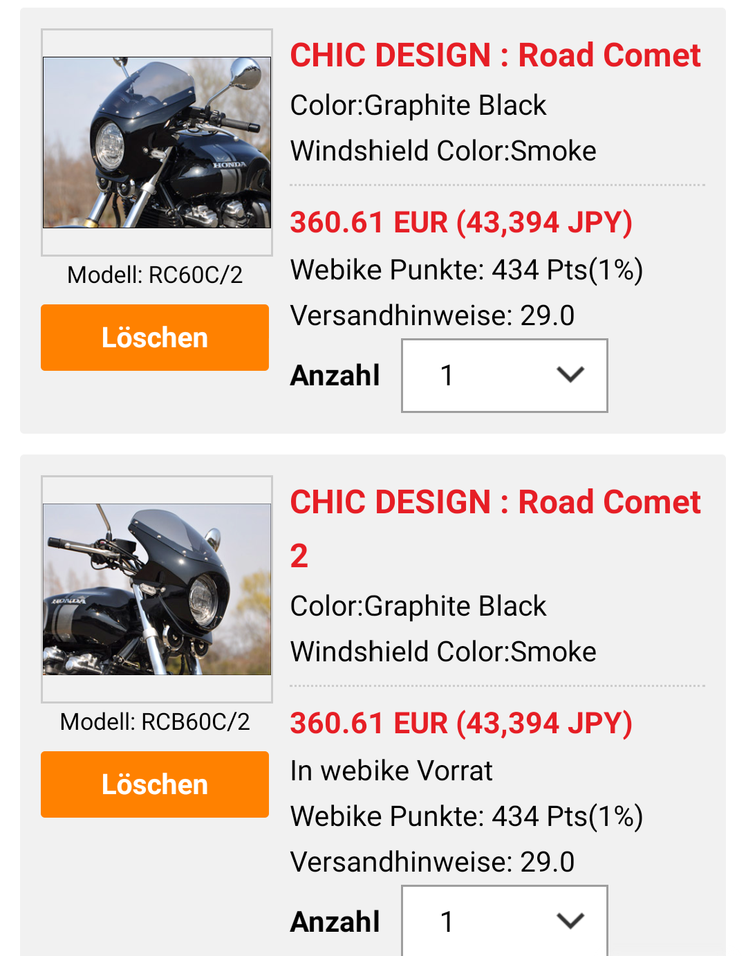 Bei meinen Überlegungen tendiere ich momentan eher zur Road Comet von Chic Design. Ist zwar teurer und dauert wohl auch länger bis sie geliefert wird, aber irgendwie gefällt sie mir grad besser. Sieht in Form und Größe für meinen Geschmack etwas stimmiger aus als die von Puig.