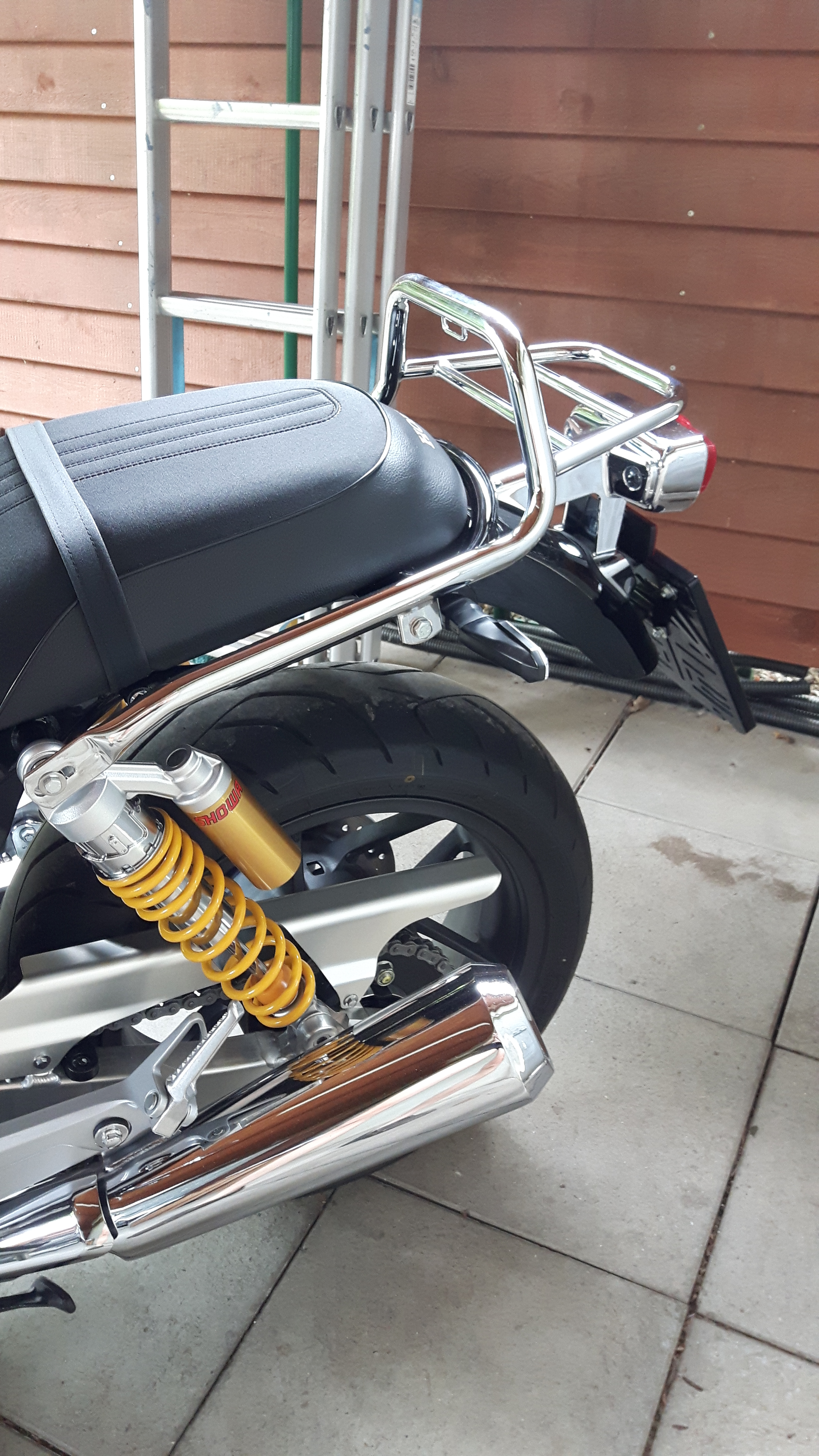 Während das mit dem Honda Gepäckträger nachvollziehbar ist (man bewahrt voll die Soziustauglichkeit) ist die Position der SLC Träger ehrlich gesagt extrem versemmelt.