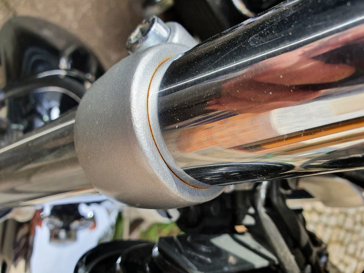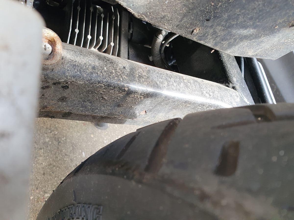 Jetzt hab ich gerade gesehen, dass an der linken Zundkerze die Beschichtung einfach so abblättert. Last but not least hab ich einen weiteren Abplatzer an der Innenseite der Schwinge - kann natürlich durch einen Stein verursacht worden sein, sieht aber auch so aus, als wollte sich da noch mehr ablösen.