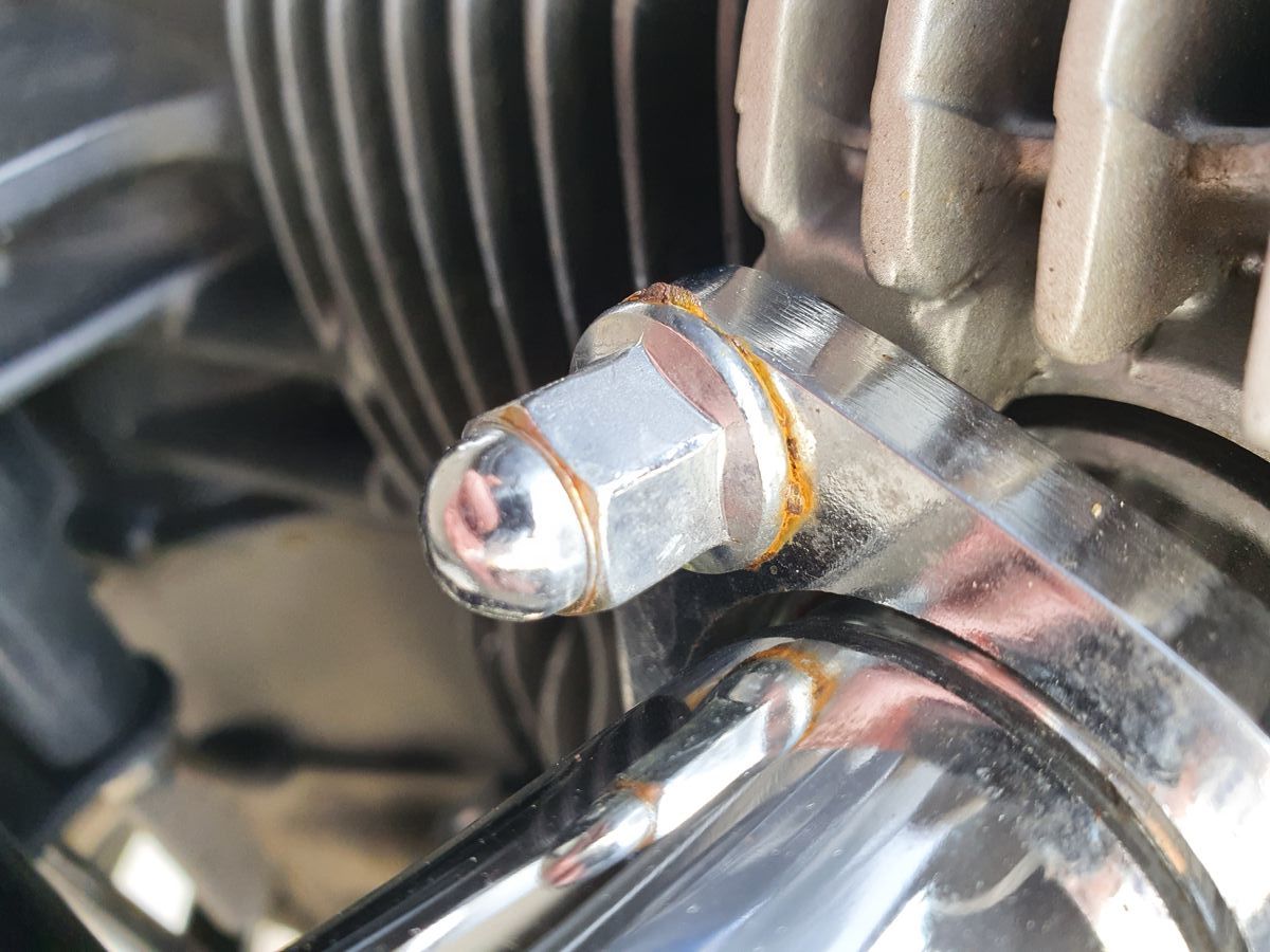 bald nach Erwerb meiner CB stellte sich hier und da Flugrost ein, kein Drama, dachte ich mir. Nach nunmehr knapp zwei Jahren sind das aber schon einige durchaus unschöne Stellen geworden. An der Gabelbrücke etwa ist mE kein sympathischer Ort, auch ein zwei Schrauben an der Bremsscheibe / Bremssattel sehen nicht nett aus.