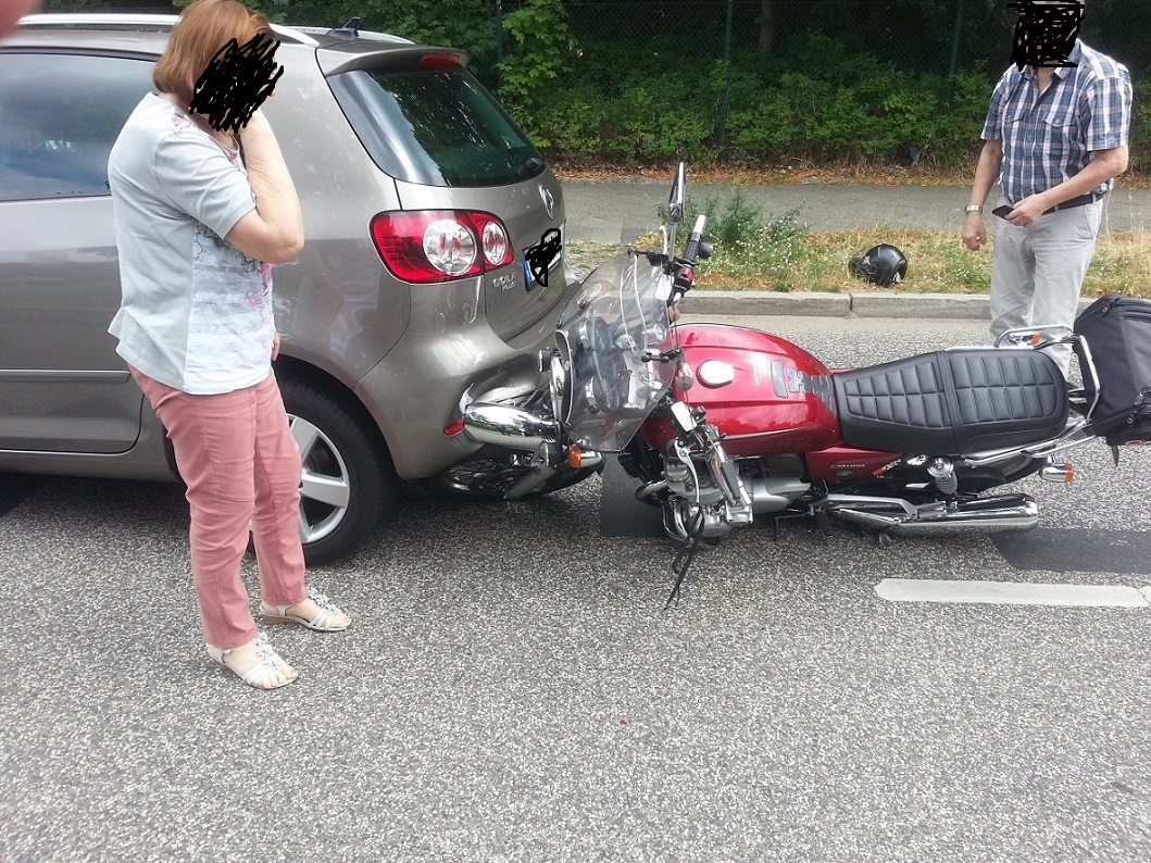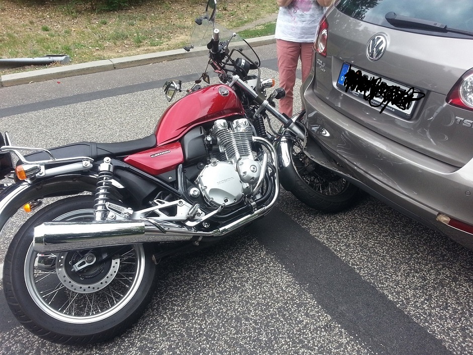 Aus einem Golf, der vor mir anhielt, sprang eine Frau heraus und wollte mich nach dem Weg fragen. Es war aber ein Automatik ... und den darf man nicht auf R stellen und dann aussteigen. So rollte der Wagen auf mich zu. Ich hatte keine Chance auszuweichen.