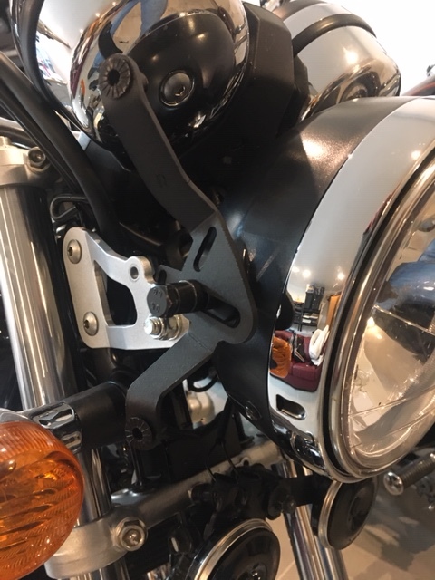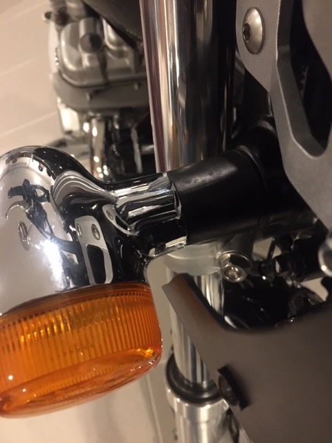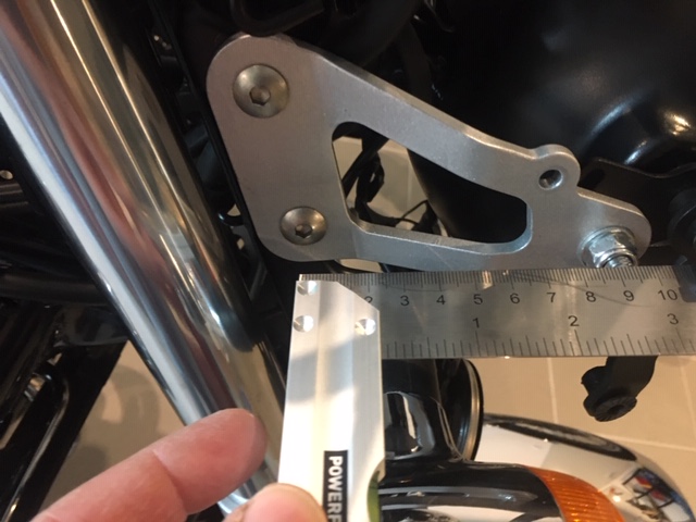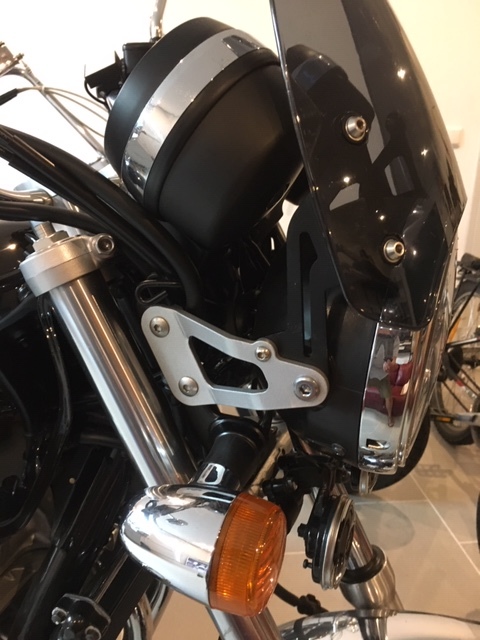 Anbau ist grundsätzlich einfach, aber mit den mitgelieferten Teilen und der HONDA original Lampenhalterung so nicht machbar, weil die Befestigungspunkte dann zu nah an den Gabelholmen liegen – die Verkleidung stößt so an Blinker und Armaturen. Da ich aber noch die Lampenhalterung einer DART Scheibe liegen hatte (25mm länger als die Originale) passte es dann doch noch; mit der PUIG Verlängerung schließt die Streuscheibe bündig mit der Verkleidung ab und der Scheinwerfer steht mit der Verkleidung in einer Flucht.
