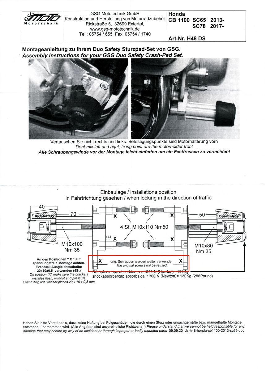 #79 Ich habe mir die GSG-Sturzpads besorgt und wollte sie am Wo. Ende an meine CB 1100 EX anbauen. Nun bin ich aber in der Anbauanleitung auf die Anmerkung gestossen "orig. Schrauben werden weiter verwendet" (siehe Anlage, Kopie von der Anbauanleitung). An sich sind für alle Motorbestigungschrauben welche gebraucht werden zum Anbau der Sturzpads auch Schrauben in der Packung gewesen (Inbusschrauben). Ich verstehe daher nicht, welche Originalschrauben ich weiter verwenden soll. Hat jemand die GSG-Pads an die CB angebaut und kann mich da aufklären?