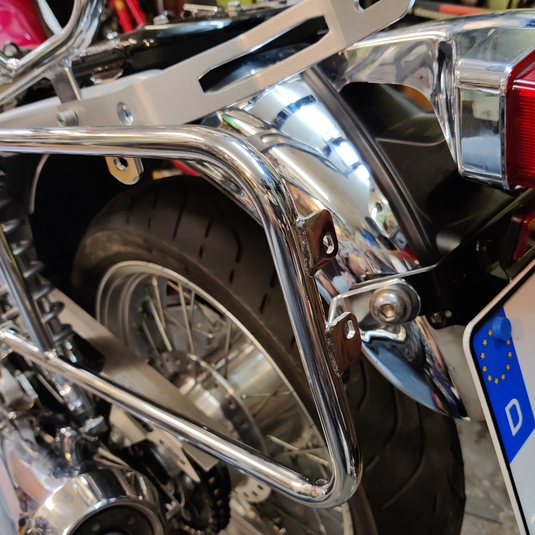 Als ich noch an Seitentaschen dacht, hatte ich ja den Schutzbügle von Fehling angebaut. Das fand ich noch passend. Aber die Halterung für die Blinkerverlegung ist schon nicht schön gelöst für meinen Geschmack.