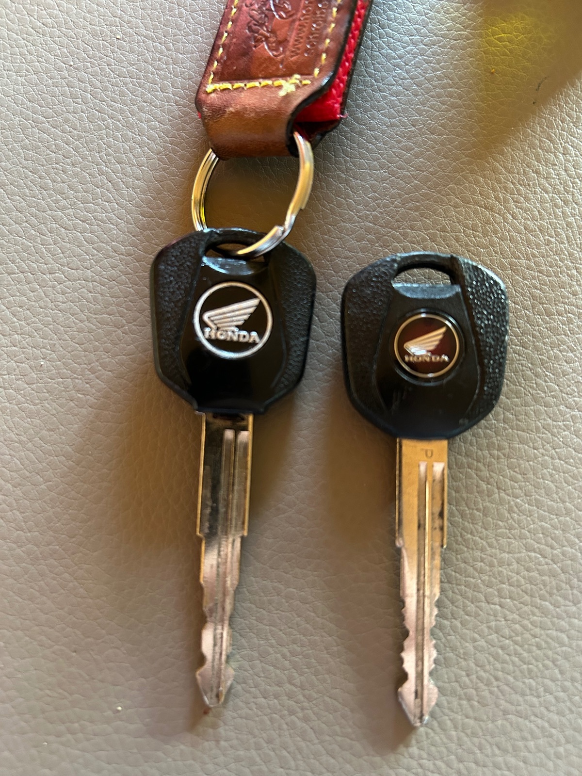 Der meiner CB aus 2013 hat, meine ich, ohne ihn zur Hand zur haben, das rote Honda-Flügel-Logo. Der links abgebildete Schlüssel erscheint mir als Ersatz angefertigt. Die Honda wurde nur mit 2 Schlüsseln ausgeliefert.