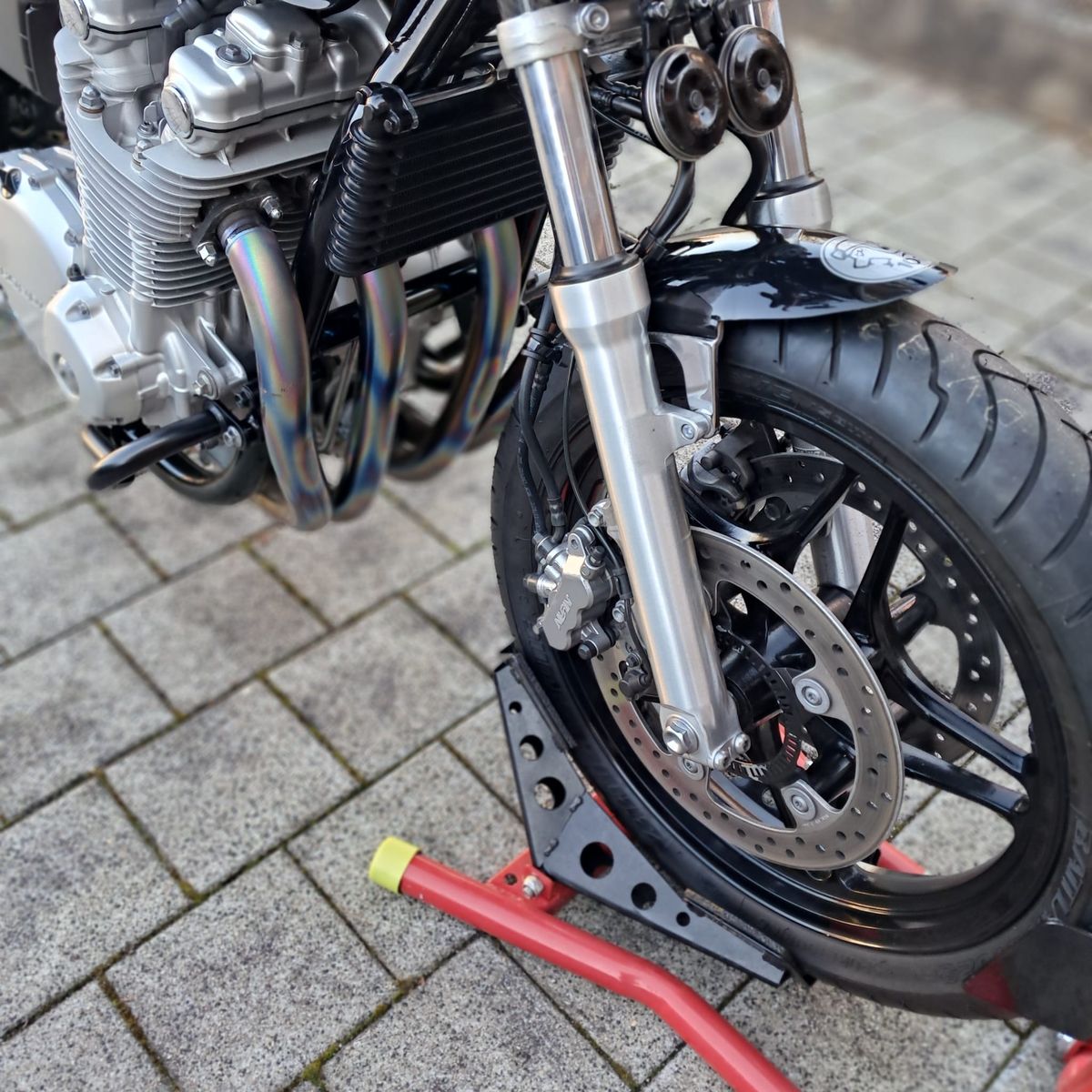 habe mir einen kleinen Frontfender gebaut , hatte 2 org. mitbekommen beim kauf meiner EX somit war klar das ich aus einem einen kleinen baue , raus kam der kurze schwarze Fender , gekürzt mittels Flex danach Radien angepasst und zum Schluss Sandgestrahlt um den Chrom runter zubekommen , danach Grundierung geschliffen Decklack lackiert geschliffen und mit Klarlack 3 mal lackiert . Logo Glemseck 101 muss sein , das lebe ich schon über 20 Jahre .
