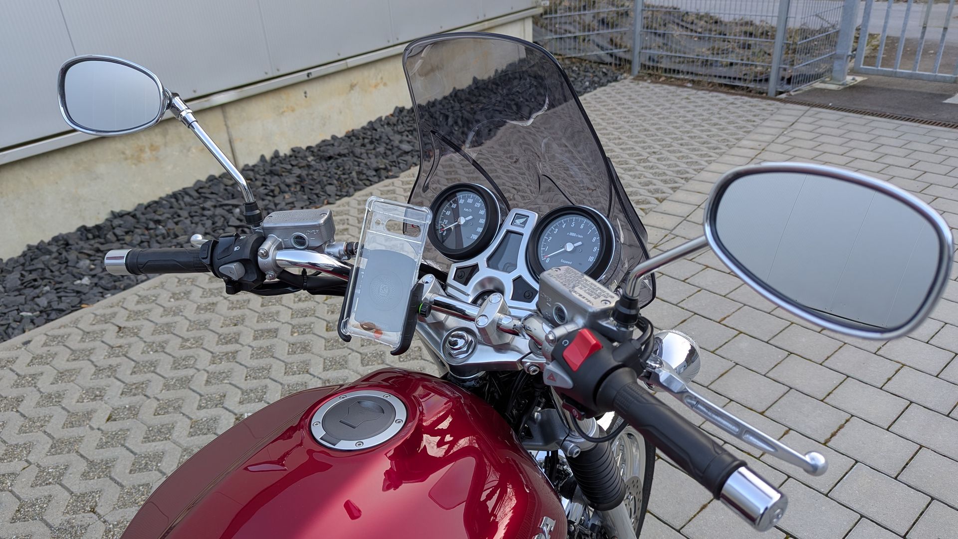 Diese Smartphonehalterung hatte ich die letzten Jahre an allen Zweirädern verbaut, auch im Wohnmobil. Sitzt bombenfest, manuelle Verstelleinheit, kabelloses Laden, IP66 wenn man den gesonderten USB-Anschluss mit dem Abdeckgunmi verklebt, hat auch noch einen Ein/Ausschalter. Anschluss über im Scheinwerfer vorhandenes Kabel, also über Zündung. Die Sicht auf Instrumenteneinheit ist gegeben. Gibt's bei A, Brcovan Motorradhalterung.