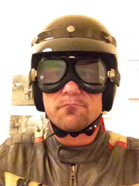 Bandit Jethelm ohne ECE inkl. Fliegerbrille, Lederjacke im 60er Schnitt und natürlich Schnürlederjeans und Biker Boots.