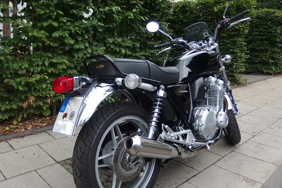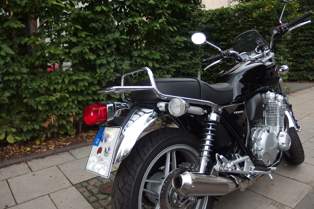 Nein im Ernst, Mr. T.T. war so freundlich mir einen schwarzen Kijima Bügel zu überlassen (gegen eine geringe Gebühr natürlich). Da ich nicht beabsichtige die CB zu beladen, habe ich meinen Fehling vorläufig abmontiert, das Heck wirkt jetzt gefälliger, nicht so schwerfällig. Für die Lampe hab ich auch ne dunkle Idee, vielleicht im Winter..