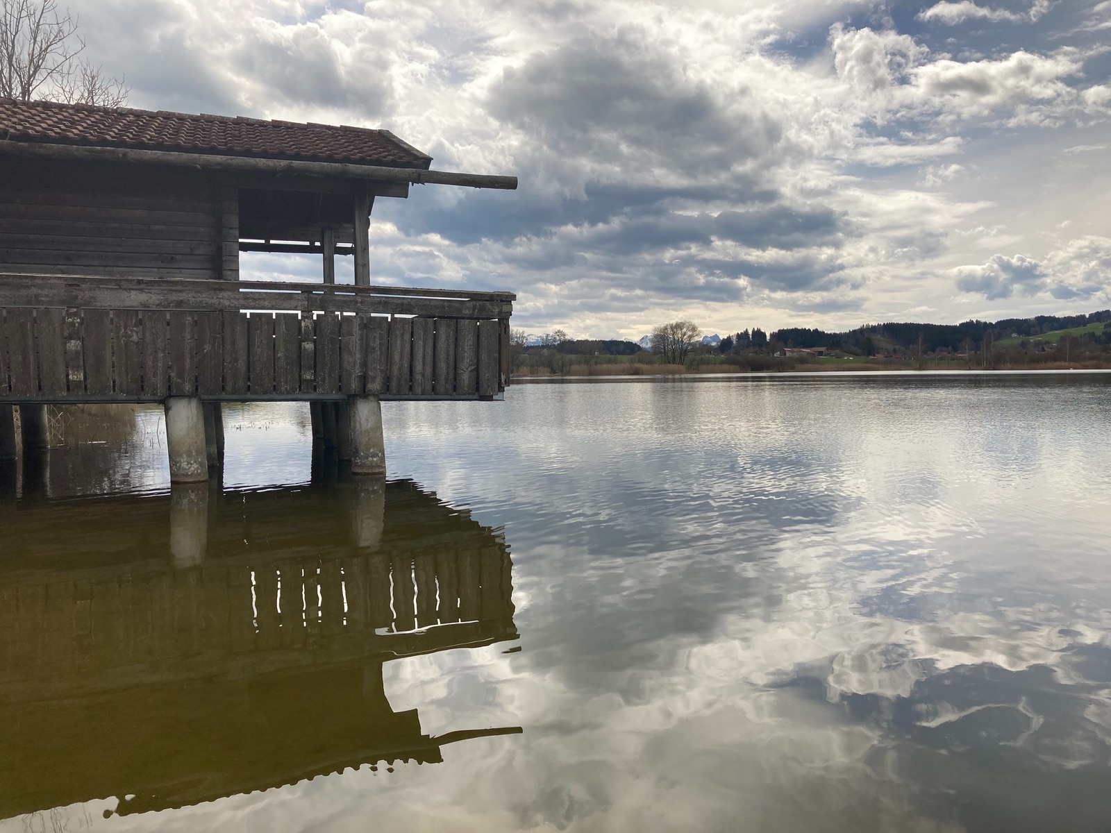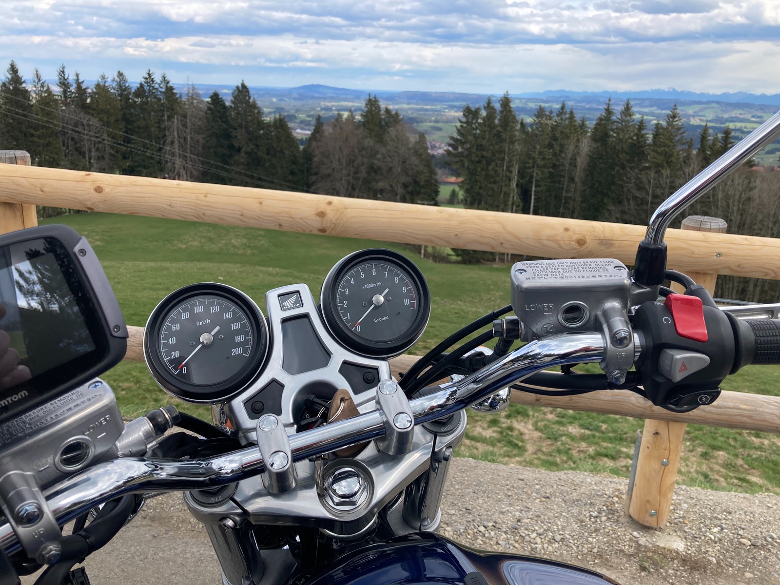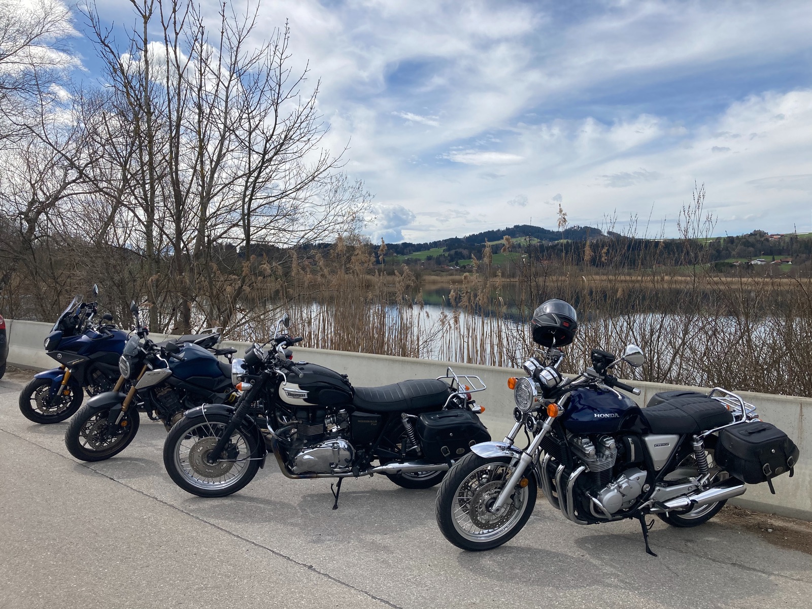 Heute hatte der Drache mal Begleitung (mit vier Bikes erfordert die neue 1,5m-Abstandsregel aber ganz schön Nerven!). Bei super Wetter, die schneebedeckten Alpen am Horizont, und warm genug trotz mancherorts Schnee am Straßenrand ging‘s z. B. zum Haslacher See und Auerberg und Kurven satt: