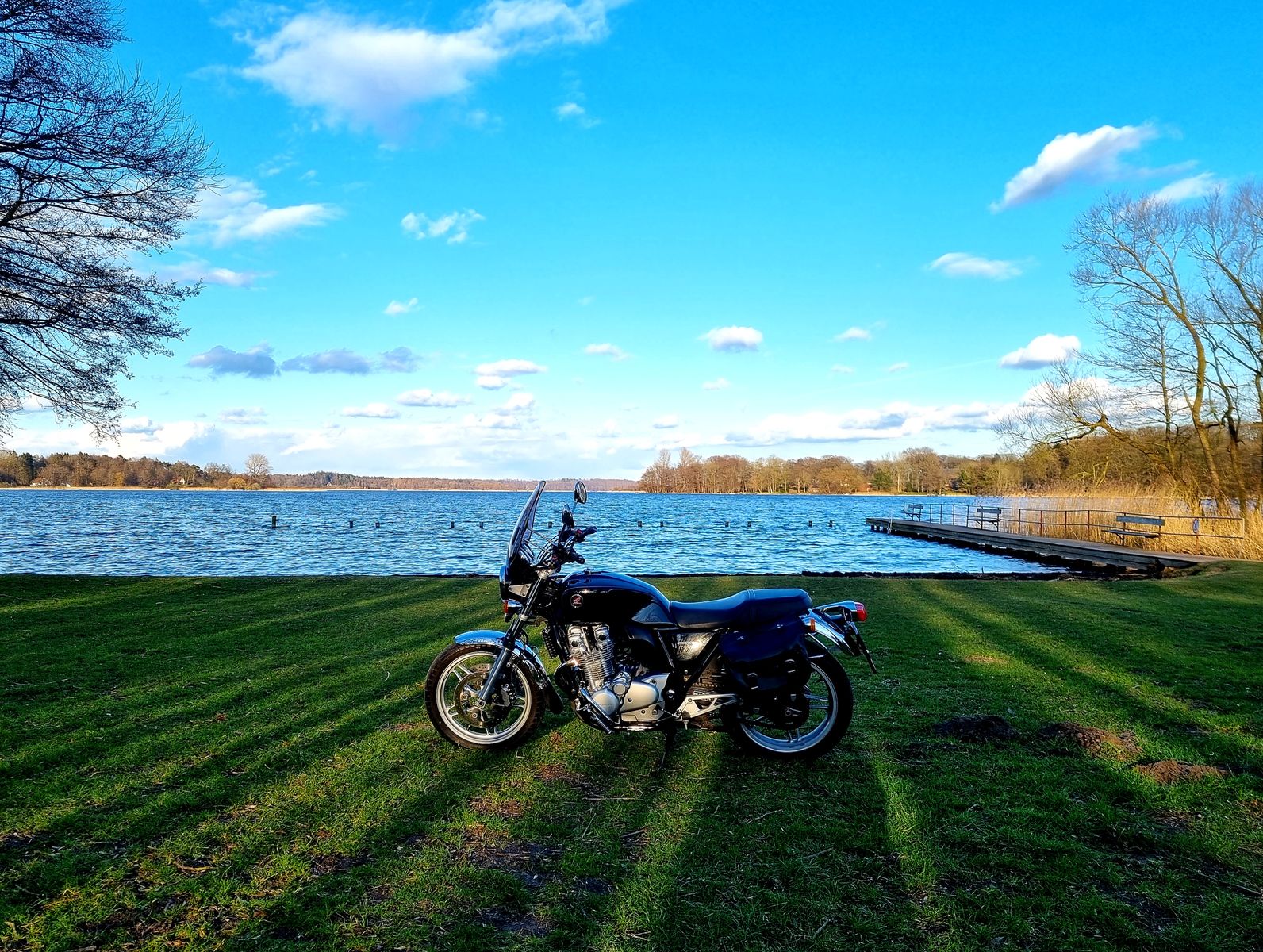 Die Tasche habe ich bei Motea bestellt; sie heißt „Craftride Hecktasche Custom SQ1“, kostet ca. €65. Ist im Prinzip wie eine Gepäckrolle, die an den Seiten tiefer gearbeitet ist. Beladen wird von oben, an den Seiten sind noch flache Taschen für Karten, etc. Befestigt wird die Tasche mit Gurten, die in die Einrastverbindungen am unteren Teil der Tasche gesteckt werden. Man kann also einfach an den Tascheninhalt ran, braucht keine Gurte oder Spannriemen dazu abnehmen. Wo genau die Spanngurte festgemacht werden hängt vom Moped ab, an der CB bieten sich beidseitig die Soziafussrastenträger und der Gepäckträger an, soweit vorhanden.