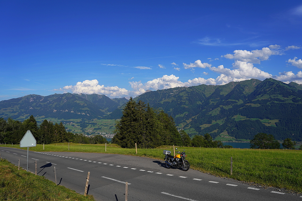 Mit dem Velo auf und auch neben dem Vierwaldstätter See. Meins ist das blaue Pedelec im Vordergrund, dahinter das "normale" 25iger meiner Frau mit Kutsche für den Zwerg.