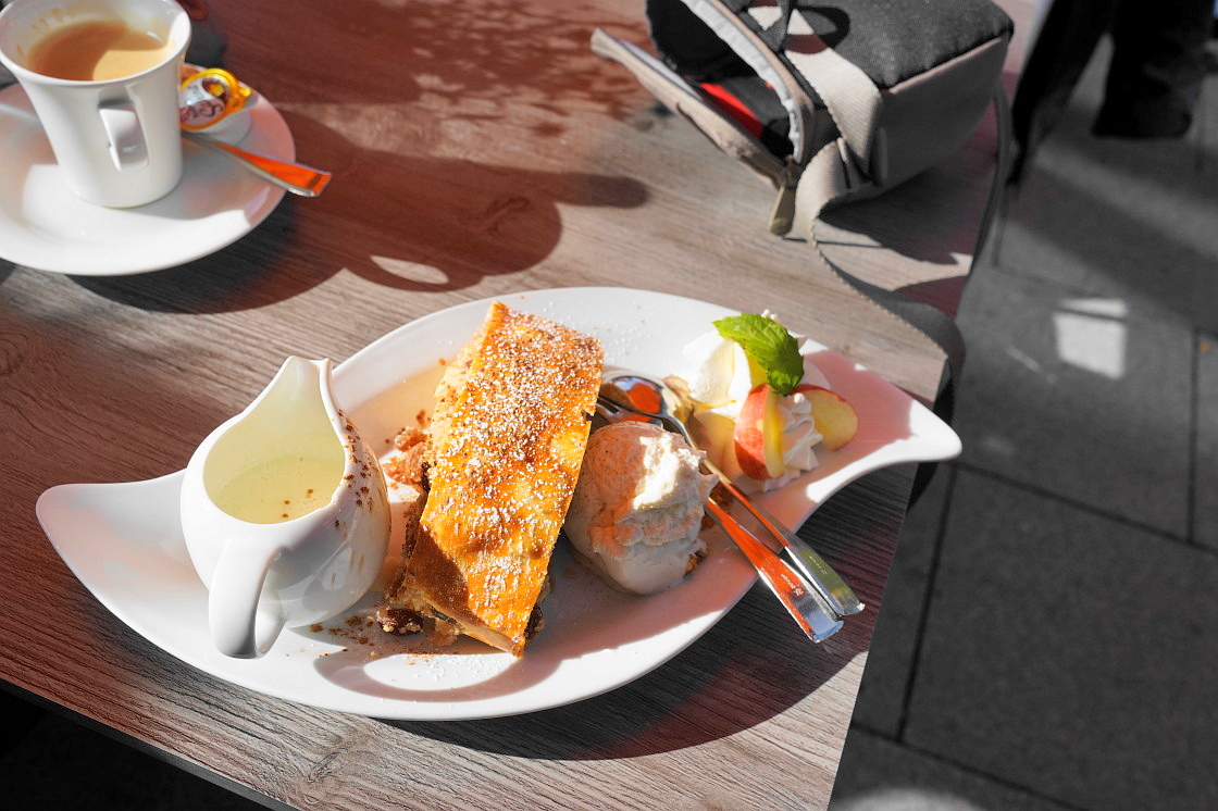 mein Dessert zum Nachmittagshalt. ... .Kaffe , Apfelstrudel mit Vanille Sauce und Vanille Glace und Schlagrahm