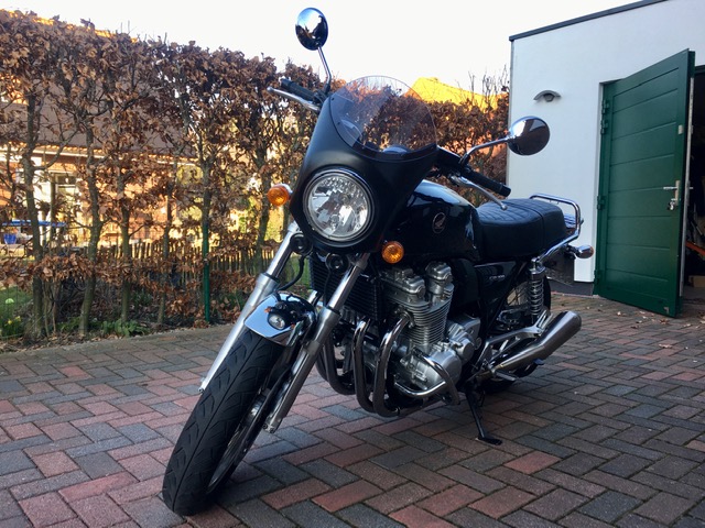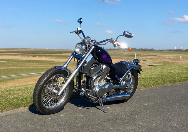 ich hatte ja neben der CB und der Harley in diesem Winter auch die 1400er Intruder meines Bruders in der Garage. Nach 8 Jahren in einer Scheune war natürlich einiges zu machen; Öle, Kerzen, Reifen, usw. Außerdem war die Elektrik in der Lampe nach Umbau auf Doppelscheinwerfer und Ochsenaugen total verbastelt, Kontrollleuchten falsch angeschlossen, und mit dem angebauten Auspuff ohne ABE gab‘s natürlich keinen TÜV. Im Februar hat es dann aber geklappt, Neuabnahme, angemeldet und ausprobiert. Läuft wieder richtig gut, und trotz 30 Jahre Patina noch ein Hingucker. Zu mehr als 80km konnte ich mich am 22. Feb. Aber nicht hinreißen lassen, 5 Grad C waren dann doch kalt.