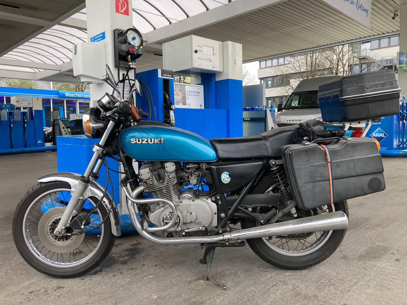 #5.217 Suzi dagegen startete heute sofort per E-Starter, den Kickstarter mußte ich nicht bemühen, hatte nur nach der langen Pause die Vergaser sicherheitshalber vorab über die PRI-Stellung des Benzinhahns (ja, so was wurde damals verbaut!) geflutet. Luft war allerdings natürlich von Nöten, danach lief sie wieder super und drehte sauber hoch bis ca. 7000 (bisschen mehr könnte sie natürlich auch, aber sollte man einer fast 47 Jahre alten Lady vielleicht nicht mehr so oft zumuten?).