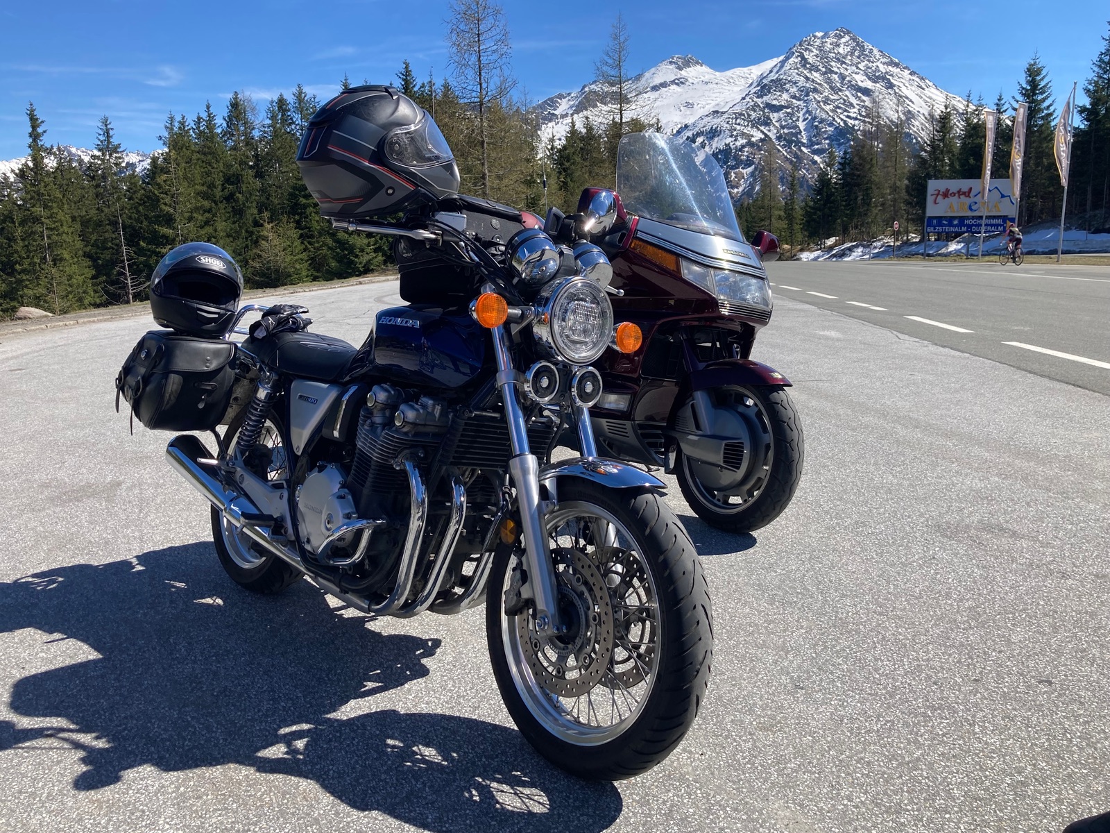 Der Plan, heute mit CB und Bonnie, einer Goldwing und einer BMW RS zu viert eine größere Runde zum Gerlospass und im Bogen zurück zu fahren, mußte angepasst werden: die Bonnie – gestern noch mit neuen Reifen etc. und frischer HU abgeholt – sagte morgens nur noch Klick, die Batterie ist wohl doch hinüber. Die Gefährtin wollte trotzdem mit, also das erste Mal eine längere Tour zu zweit auf dem Drachen. Und ja, er fliegt auch zu zweit gut über die Pässe, lässt sich fast genauso leicht wie solo durch die Kehren lenken. Wurden dann in Summe über 430km heute. Und ab morgen schaue ich dann mal nach der Batterie der Bonnie…