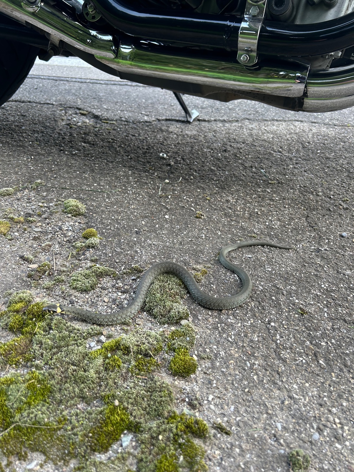 Ja, der Ringelnatter ist nichts Passiert, ist gut über die Straße und ins nächste Grün gekommen.