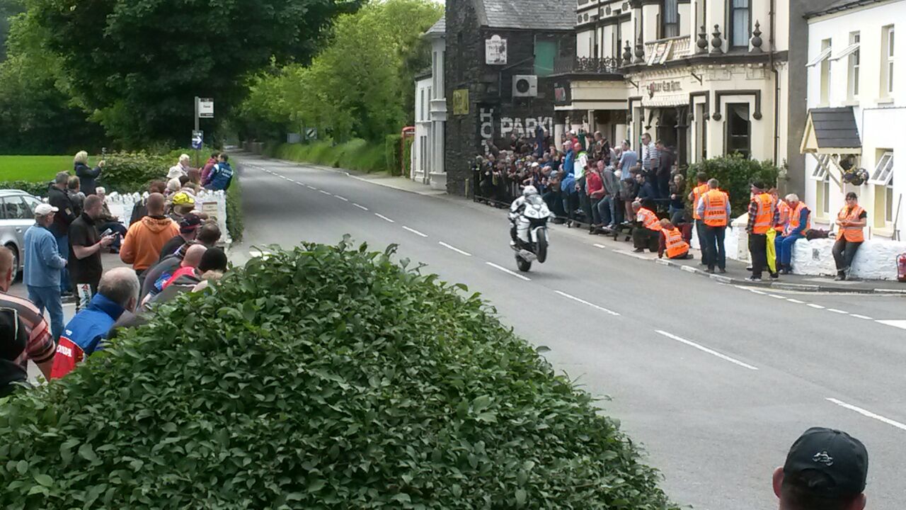 Hier sind die zwei der gewünschten Bilder. Das Motorrad, was das Vorderrad hebt, fährt gerade am berühmten Sulby Straight entlang, dort ist eine Bodenwelle, die das Abheben auch noch bei Tempo 300 km/h ermöglicht. Das andere Bild zeigt die schöne Honda neben der Aprilia meines Sohnes.