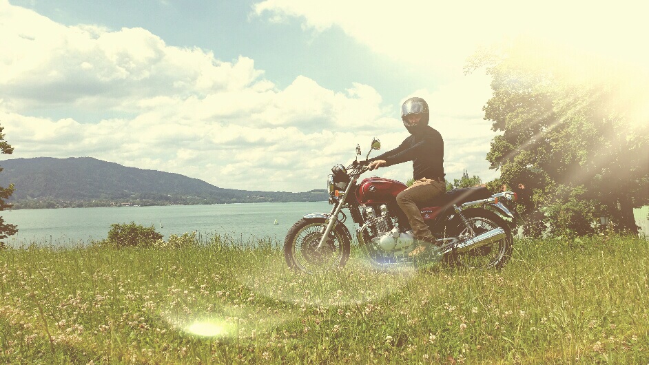 Fahre auf langen Touren einen Schuberth S2, für kurze Strecken zum See oder ins Café ein Halbhelm von MTJ mit Pilotenbrille.