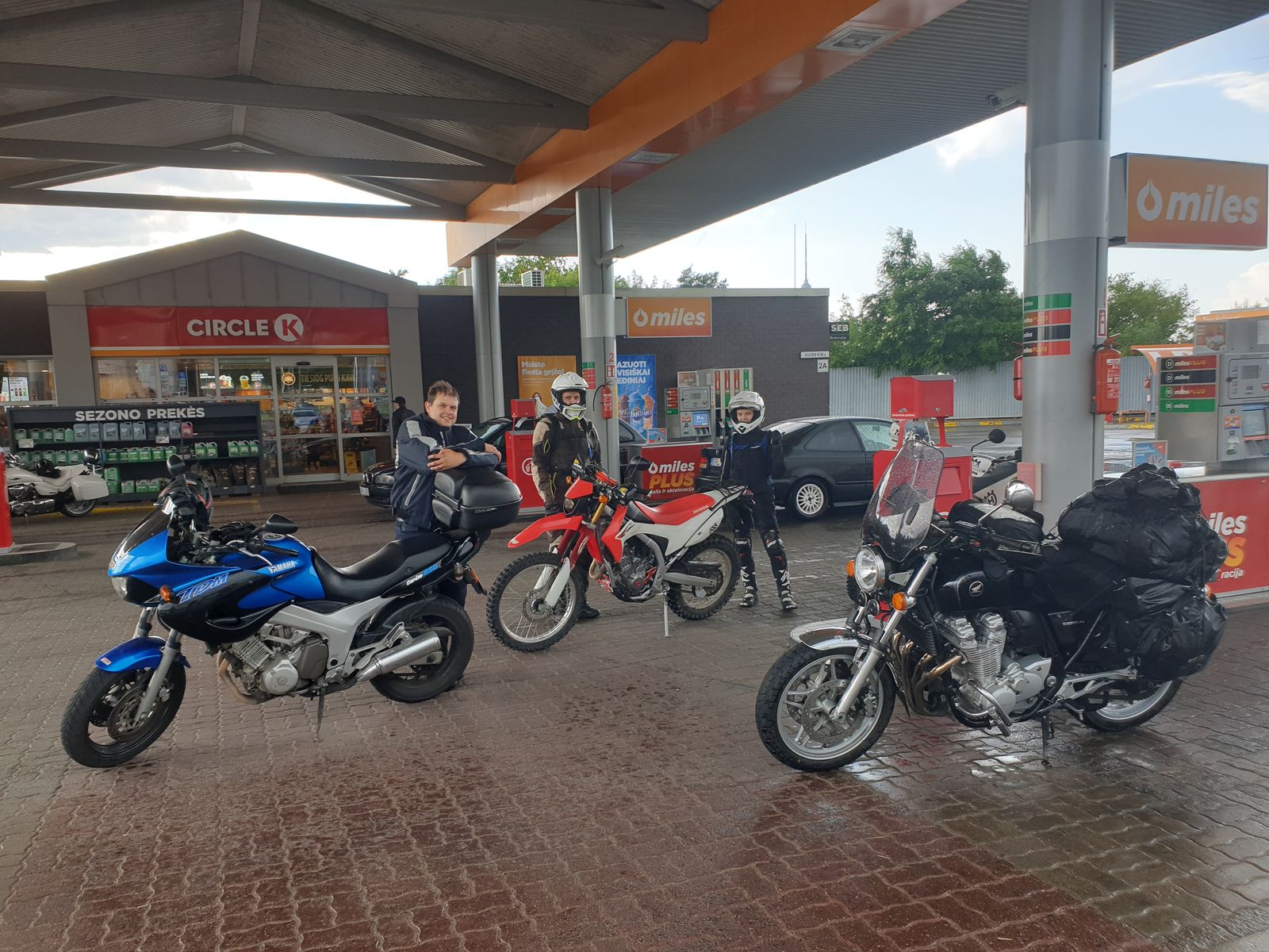 Zuflucht unter dem Dach einer Tanke in Vilnius vor dem 1. Regen seit langer Zeit. Dafür kams gleich sintflutartig für eine halbe Stunde vom Himmel geschüttet. Die Zeit mit litauischen Motorradfahrern im Smalltalk vertrieben.