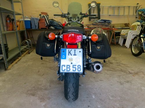 An den Packtaschen gefällt mir die Möglichkeit, den Stauraum auf knappe 30l pro Tasche zu erweitern mittels eines Reissverschlusses. Natürlich tragen sie dann ein wenig dick auf, fügen sich aber insgesamt im eingefahrenen Zustand gut in das Gesamtbild der Honda ein, wenn man darauf steht, das Motorrad nicht nur als Naked Bike zu fahren, was ich tue. Die CB ist für mich eher eine Tourenmaschine und muss trotz allem Klassizismus verwertbare praktische Seiten wie Transportmöglichkeiten und relativen Wetterschutz bieten.