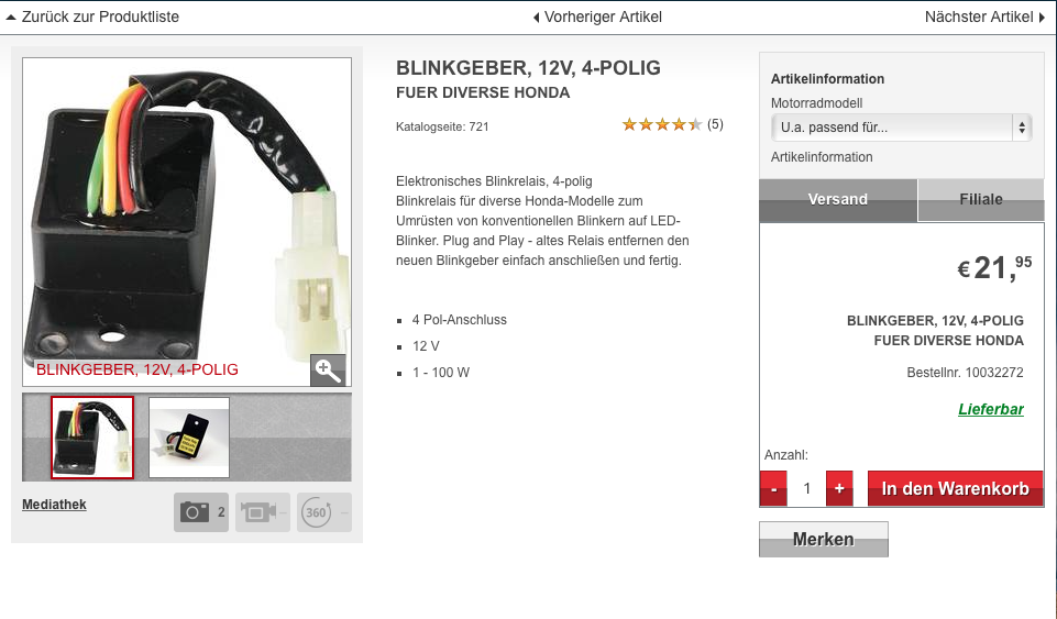 Ich habe jetzt mal bei Louis angerufen, leider können die mir nicht sagen ob das Blinkerrelais für die CB passt da dieses Modell nicht aufgeführt ist.....ich soll es doch einfach mal bestellen ?!?