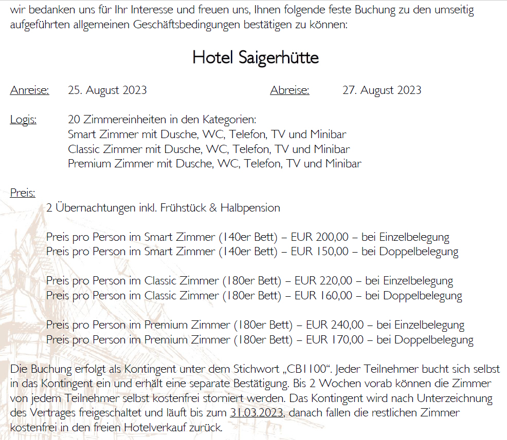 20 Zimmer sind für unser Treffen 2023 im Erzgebirge reserviert. Den Vertrag habe ich mit dem Hotel Saigerhütte in 09526 Olbernhau geschlossen. Habe schon versucht das Abrufende des Zimmerkontingentes über den 31.03.2023 zu verlängern, leider ohne Erfolg. Dafür bietet dieses Hotel kostenfreie Stornierung bis 2 Wochen vor Anreise, andere liegen da bei 8 Wochen. Jeder Teilnehmer bucht sein Zimmer selbst auf eigene Rechnung unter dem Stichwort CB1100.