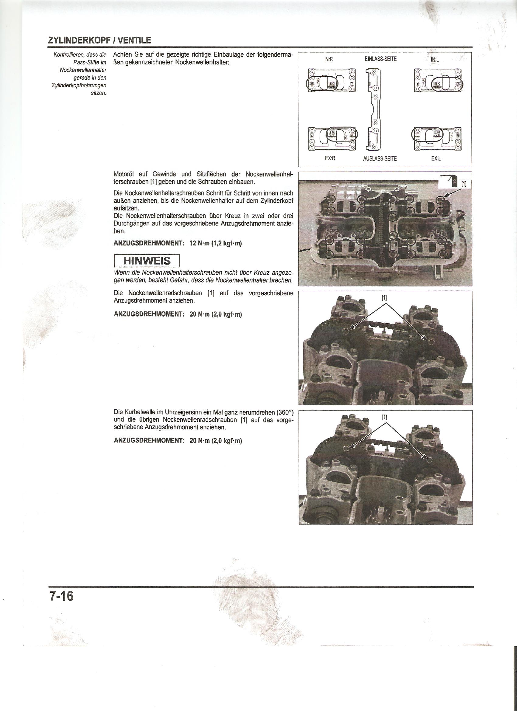 Beim zweiten Versuch, sprang sie an, aber im 1. Zylinder-IN-Seite- empfand ich die Geräusche lauter, als vorher (Ventilspiel vorher 0,2/0,18, jetzt 0,16/0,16). Im Zylinder 4 auf der EX-Seite dafür Ruhe (vorher 0,35/0,34, jetzt 0,3/0,31). Der 4. Zylinder hatte mich veranlasst, mal nach dem Spiel zu schauen, da er Klackergeräusche von sich gab.
