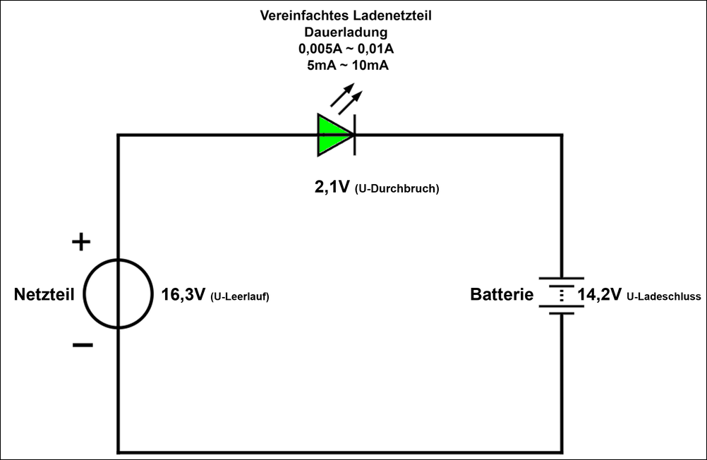 Ich nehme also ein ungeregeltes 12V-Netzteil mit einer Leerlaufspannung von ca. 16V habe und setze eine grüne LED in Reihe, die eine typische Durchbruchspannung von 2V hat. Damit kommt bei der Batterie eine konstante Ladespannung von 14V an (bei diesem Netzteil von 16V Leerlaufspannung ungeregelt). Die Strombegrenzung erfolgt automatisch als Summe der beiden typischen Werte Ladeschlussspannung und Durchbruchspannung von Batterie und LED. Das Netzteil wird bei vollem Akku in den Leerlauf getrieben und kann so nur einen minimalen Strom abgeben. Deswegen funktioniert das auch nur mit ungeregelten Linear-Netzteilen. (Trafo/Gleichrichter/Elko/Ausgang)