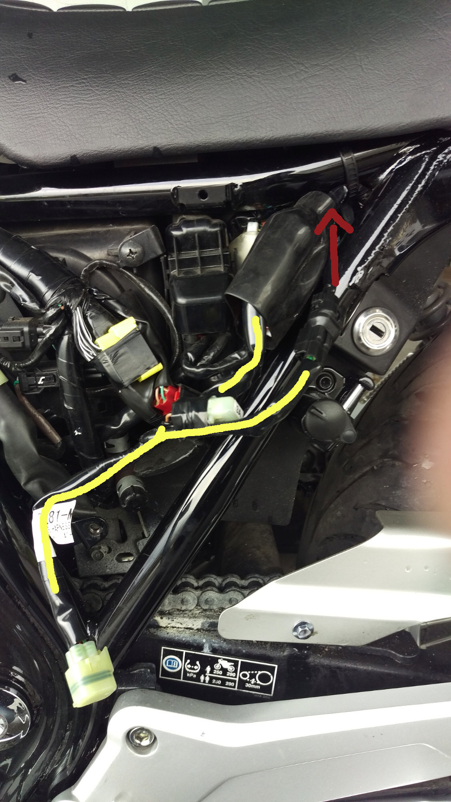 Weil das alles nicht so gut erkennbar ist, hab ich die Kabel nochmal farblich nachgezogen. Einfach anstecken. Da kannst nix falsch machen. Das rot nachgemalte Kabel geht hoch unter die Sitzbank zur Steckdose.