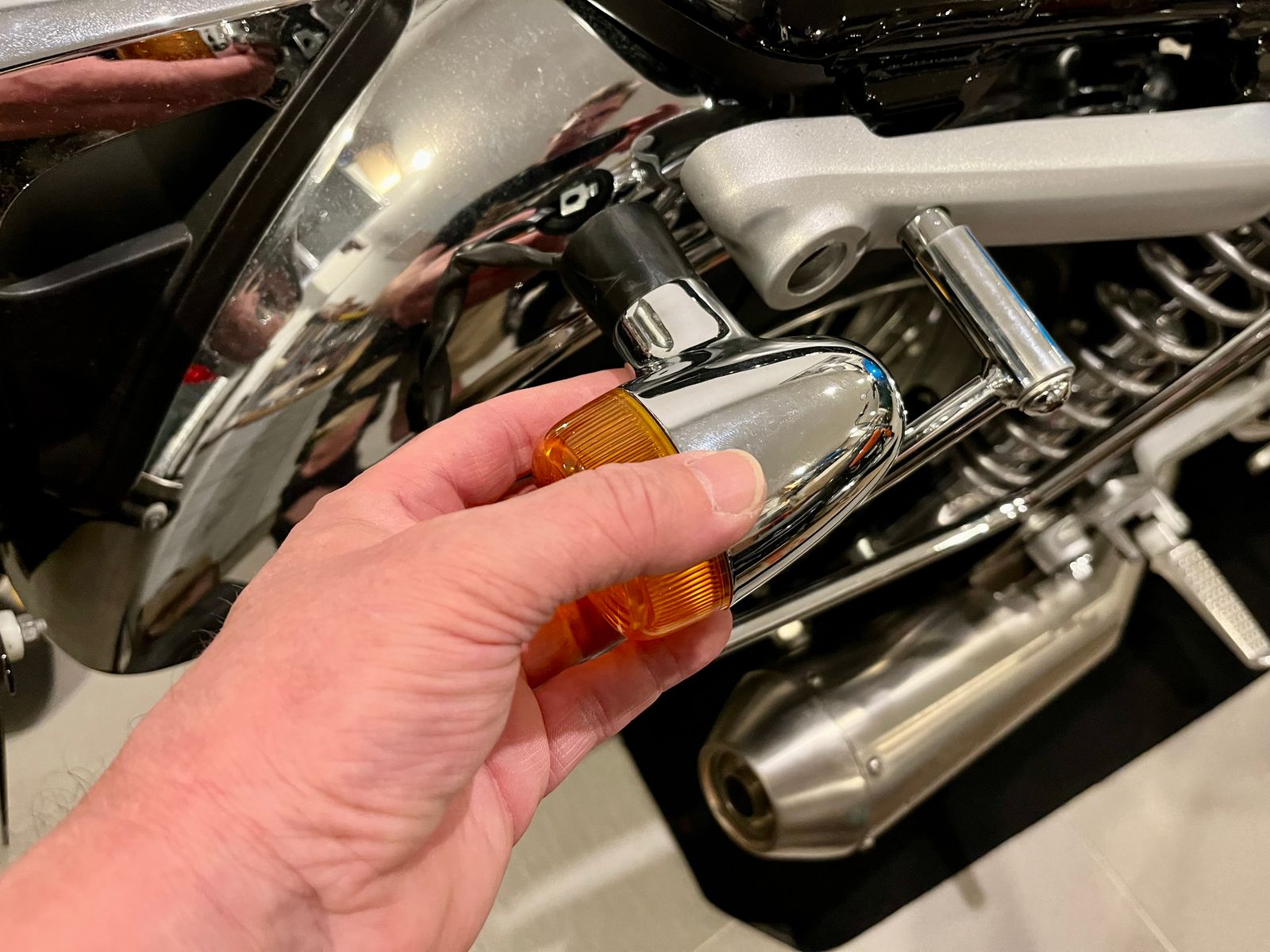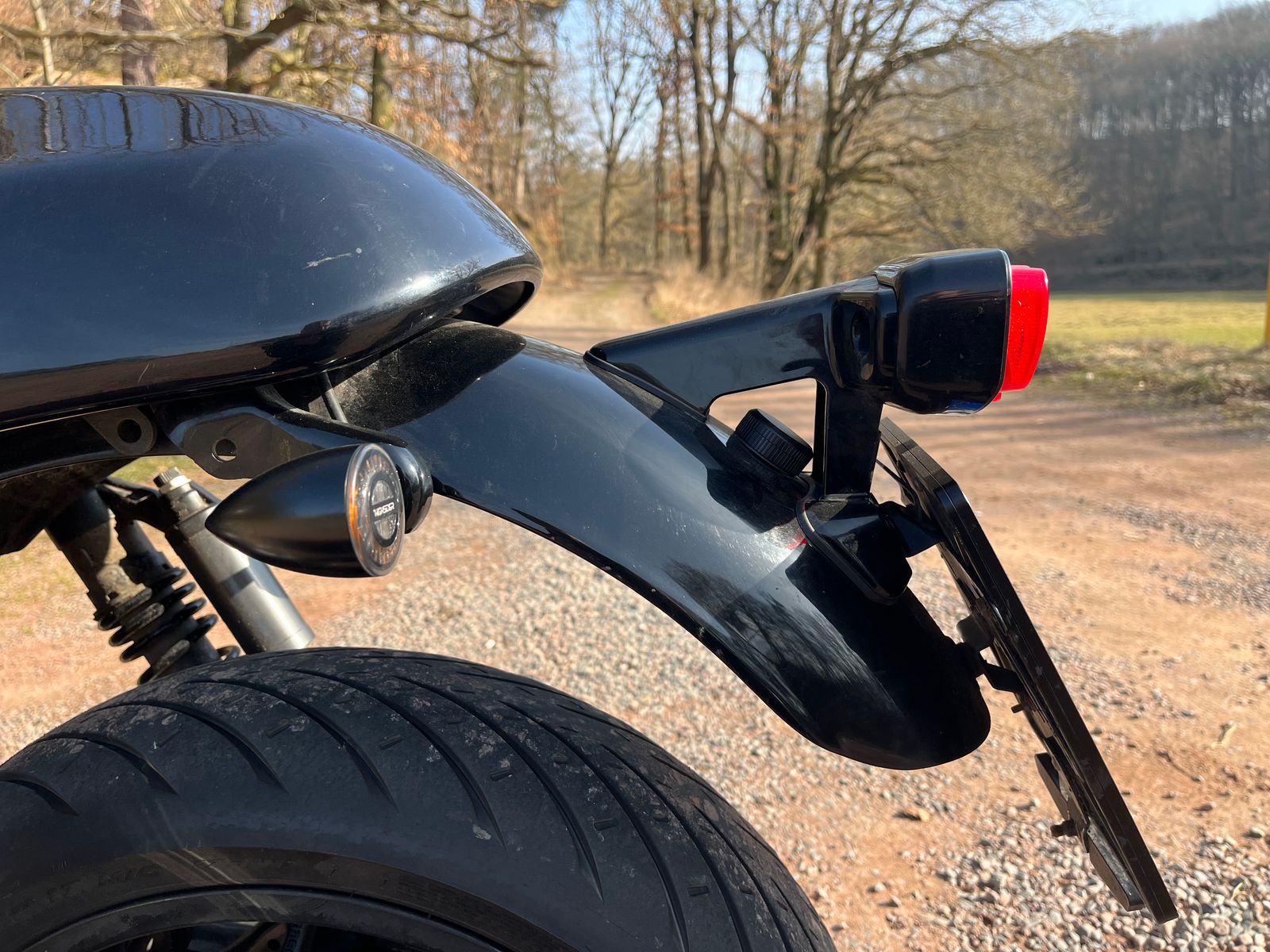 Ich habe noch ein Fehling Blinkerversetzungsblech liegen (wird zwischen Kennzeichenhalterung und Rücklichthalterung gebaut) ... gefällt mir aber nicht so richtig, weil die Blinker dann optisch zu weit hinten sitzen. Diese Versetzung macht eher Sinn bei sehr großen, langen Taschen.