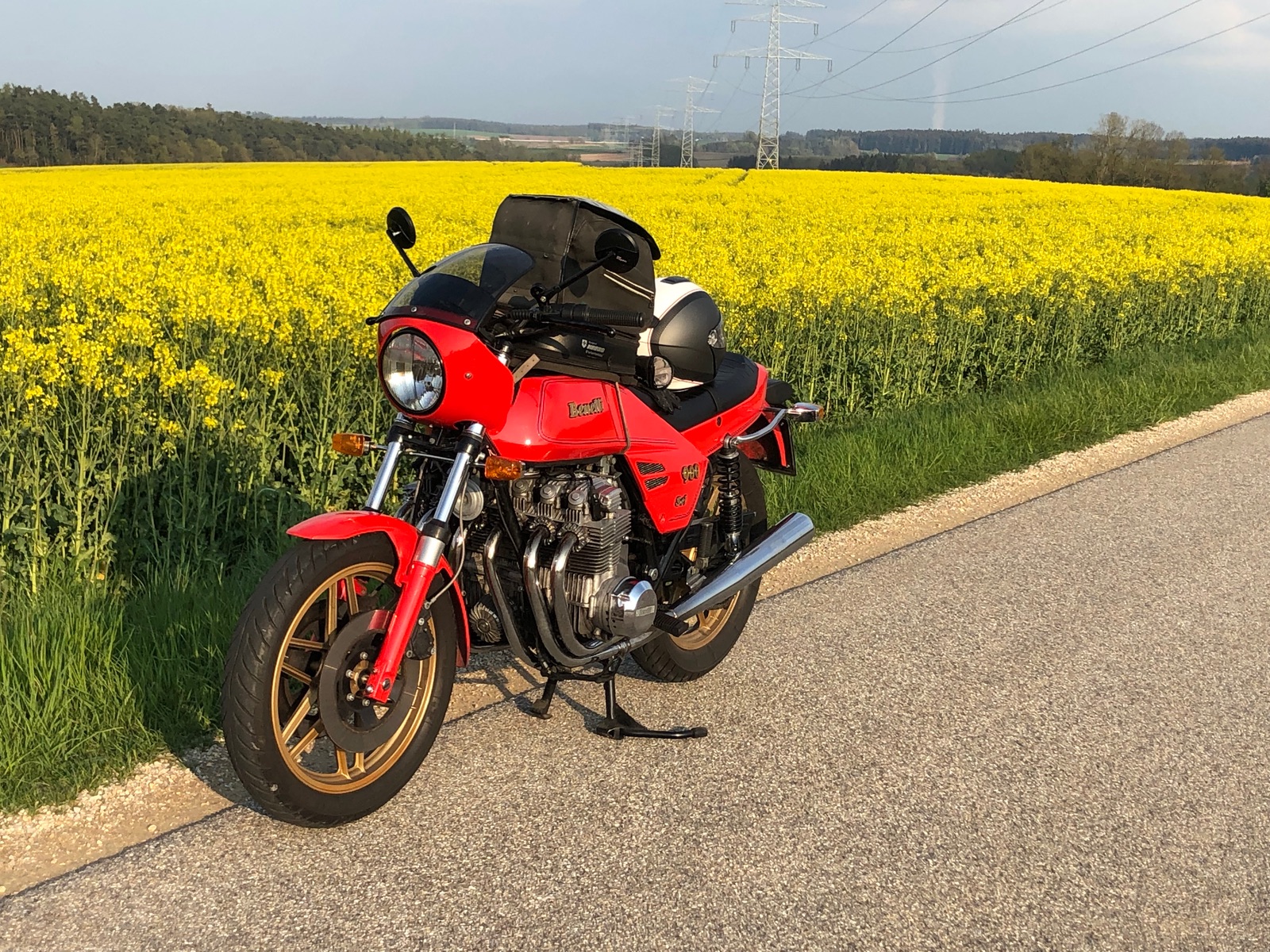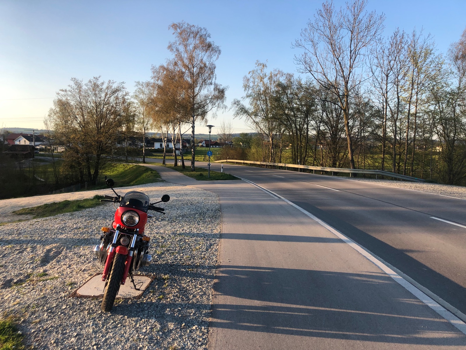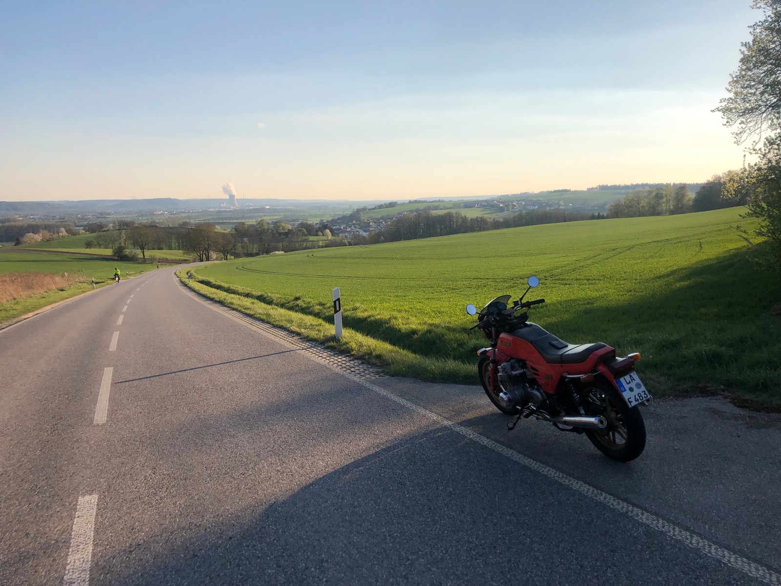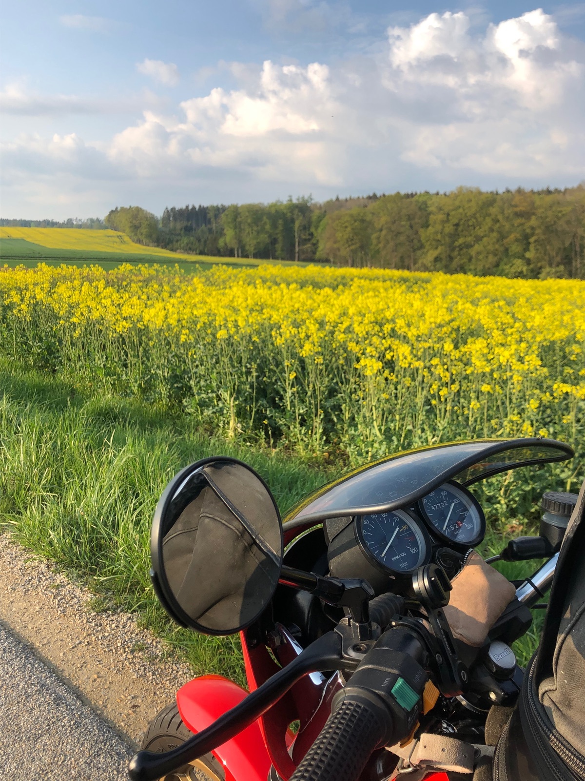 Danach natürlich noch einen kleinen Umweg gefahren. Der Motor muss ja schließlich durchgewärmt werden. Ich finde, dass die rote Farbe sich vor dem Rapsfeld besonders gut macht…
