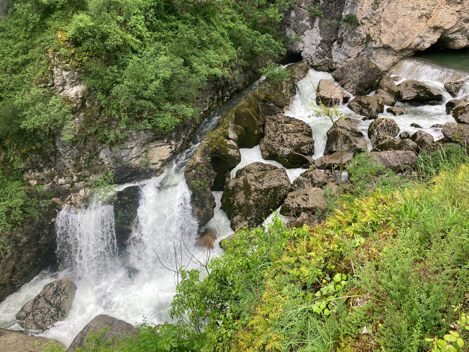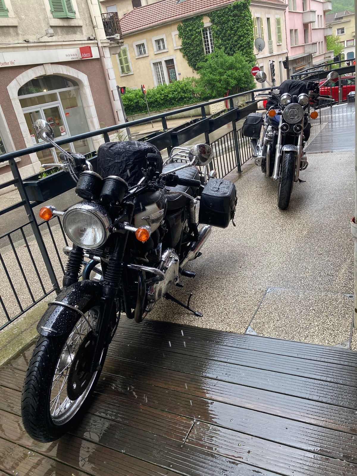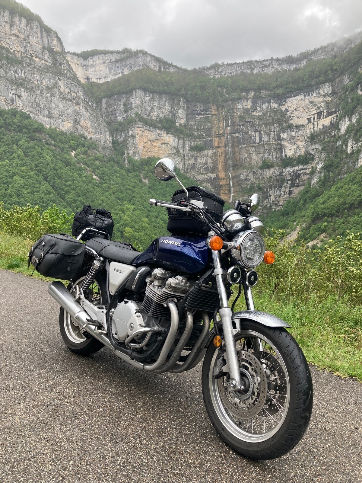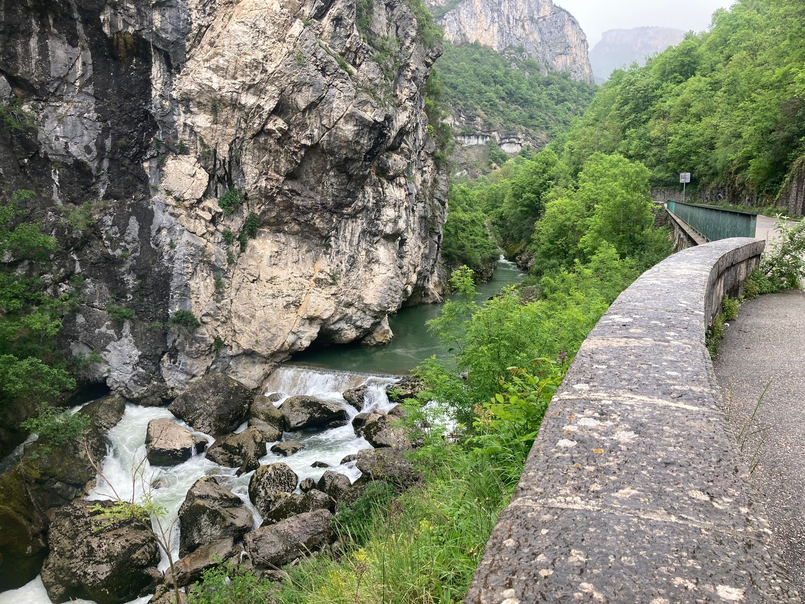 Und wir hatten heute schon teilweise Sonne auf dem Weg von Villard-de-Lans zu unserem nächsten Zwischenstopp vor Carcassonne: Alès. War gut, daß wir entsprechend den Regenradarinfos mehr Richtung Süden strebten. Der spektakulärste Teil heute war gleich die D531 östlich von Villard-de-Lans, dort allerdings leider in großen Teilen noch bei Regen (meine angeblich wasserfesten Handschuhe nervten dabei sehr, das blöde Innenfutter verhakelt sich im durchnässten Zustand dann oft – kam ewig nicht mit den Fingern rein, muß da wohl mal nach der Tour was neues anschaffen).
