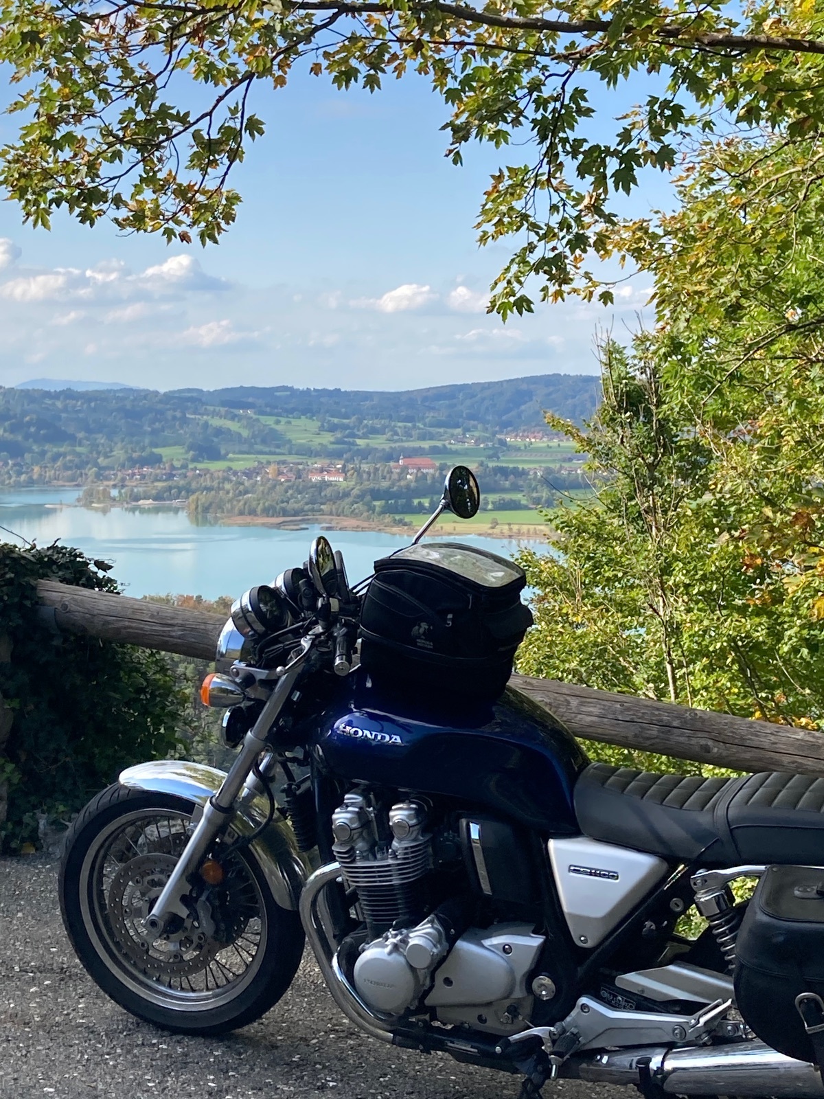 Auch wir genossen heute die Herbstfärbung, wenn auch ohne Sonne – bei relativ frischen Temperaturen halfen Griffheizung und Regenjacke über der Lederkombi: 319km-Runde Hochpeißenberg (ohne Stopp, da voll im Wolkendunst), runter nach Füssen, am Forggensee wieder nach Norden, und nach leichtem Regen zwischendurch eine Aufwärmpause in der Schönegger Käsealm nahe Lechbruck, mit entsprechender Stärkung!