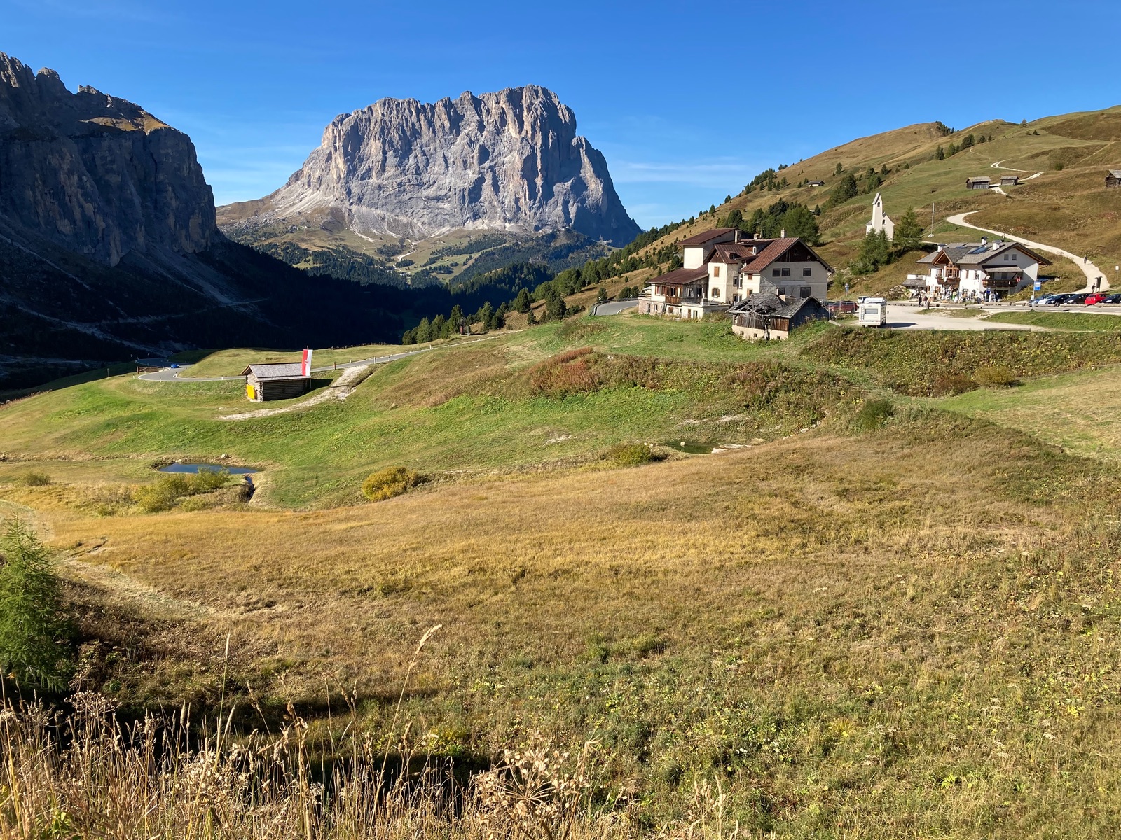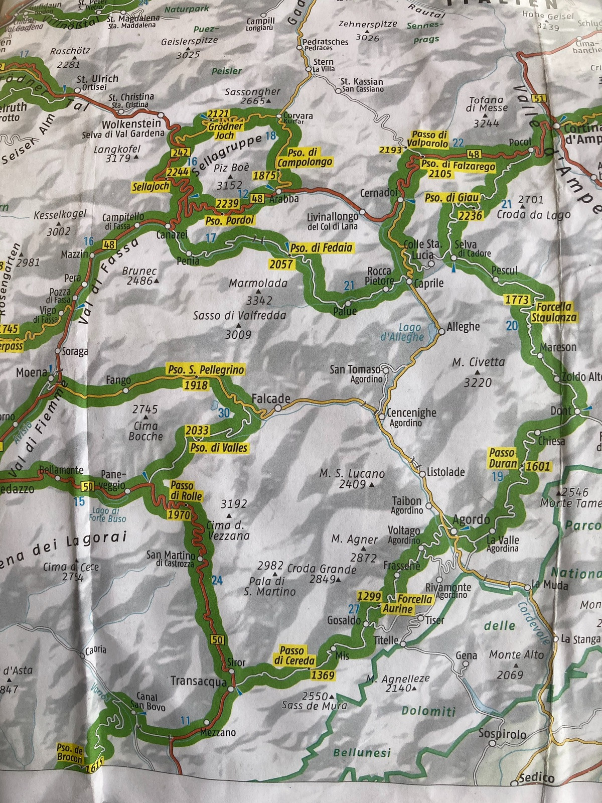 Heute Pässe satt in den Dolomiten: Neben den höheren Passo Pordoi, Passo di Falzarego, Passo di Giau und abschließend Passo di Rolle machten vier kleinere wie der Passo Duran die Runde bzw. die 8 voll bis zurück in‘s Val di Fassa! (unten eine Karte der Runde).
