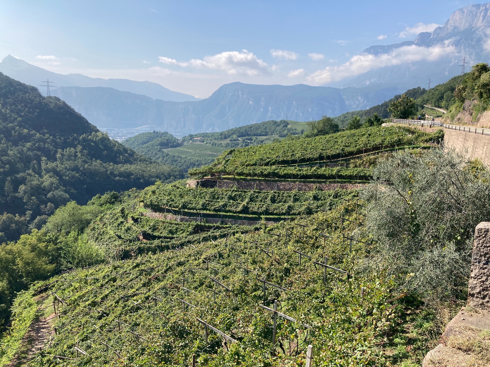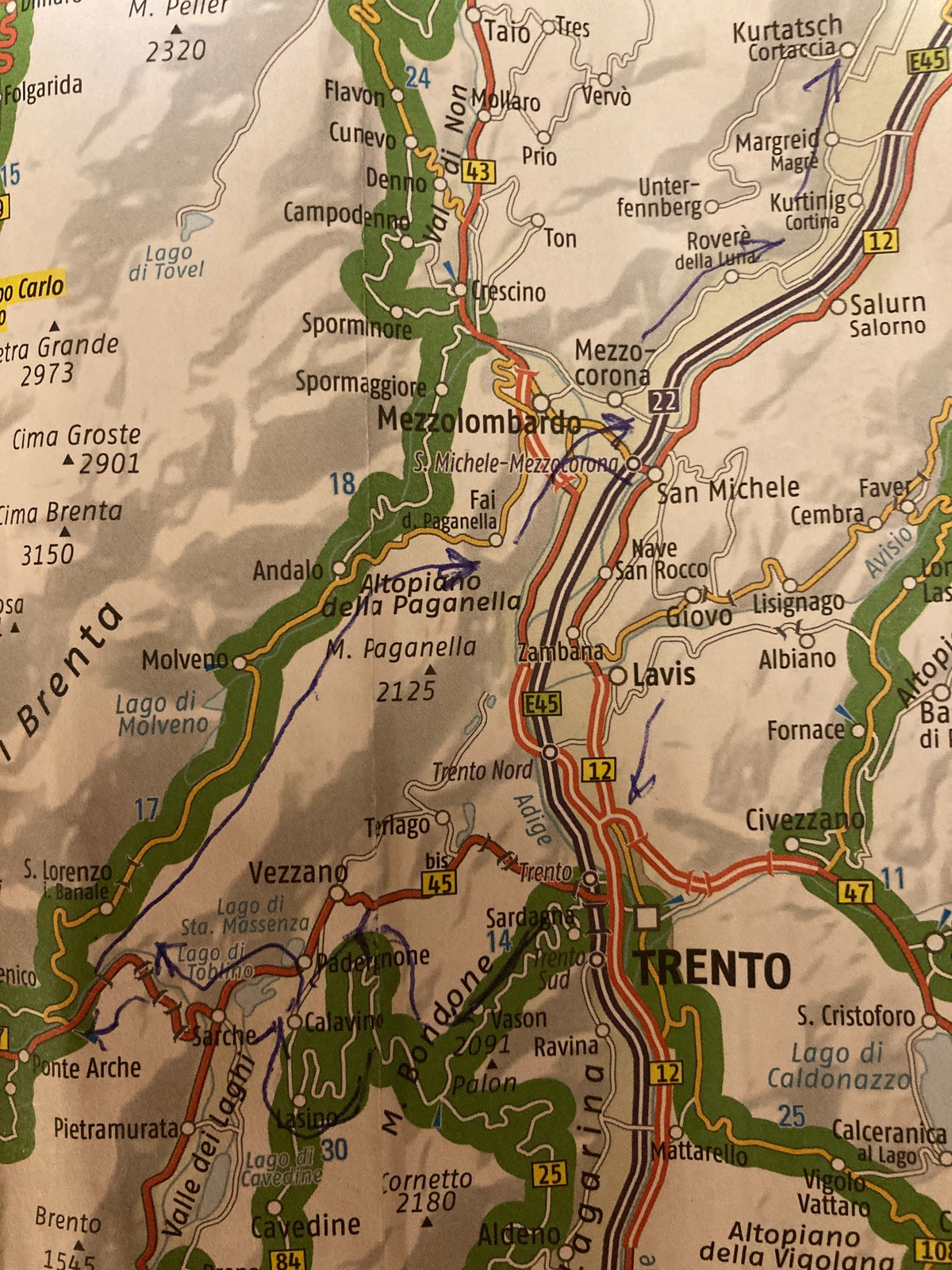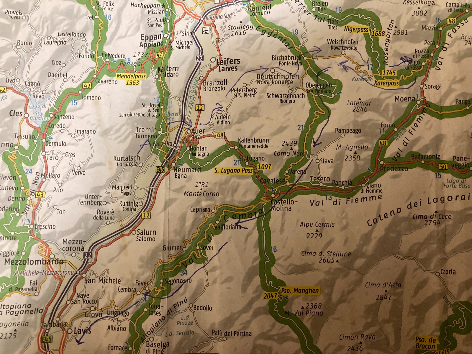Heute dann etwas „sanftere“ Landschaft: über den Karerpass Richtung Südwest über/ durch das fantastische Val di Cembra, danach durch Weinterrassen zum Monte Bondone, dann im Bogen über S. Lorenzo in Banale, eine Weinstraße und durch Apfelplantagen bei Mezzo-Corona zurück (Karte mit markierter Route unten).