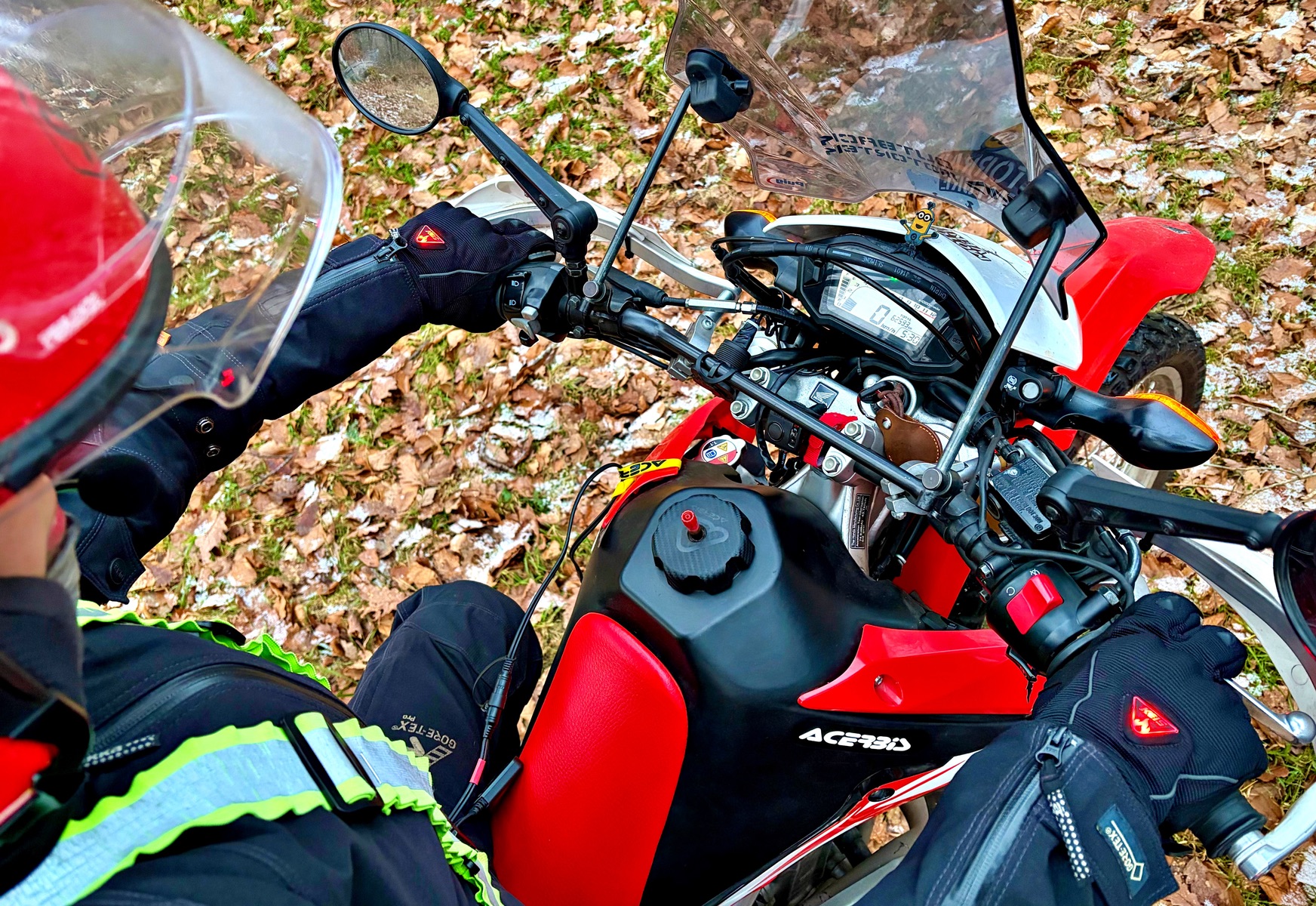 Wir gucken da dass alles passt bzgl. der gefordertenLeistungsausgabe, laden nur mit zertifiziertem Equipment und unterlassen tunlichst alle mechanischen Belastungen. Trotzdem ist es besseres Gefühl die Jacke, Handschuhe und/oder Socken über's Motorrad laufen zu lassen. Die LiMa der kleinen CRF macht das locker mit.