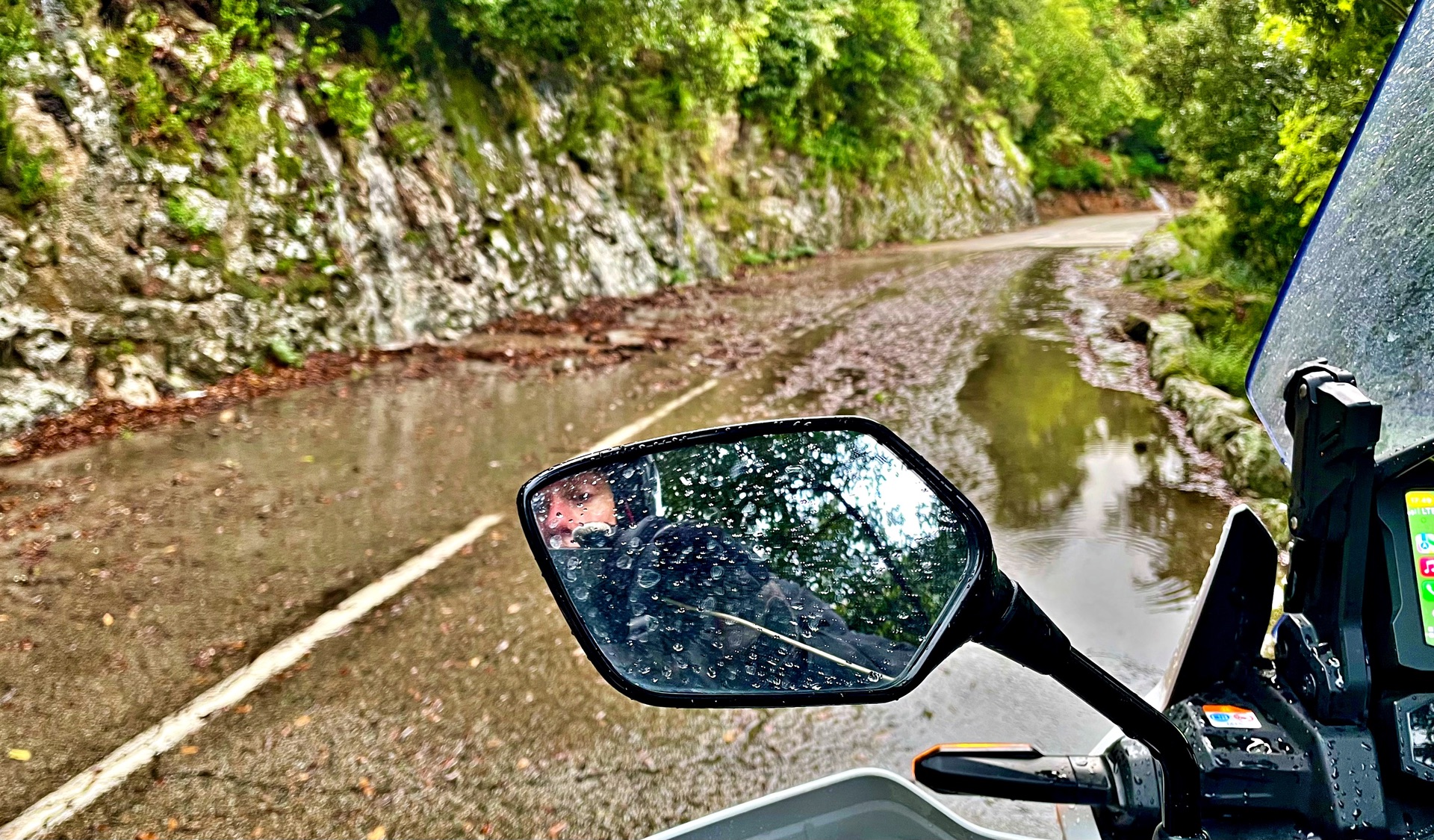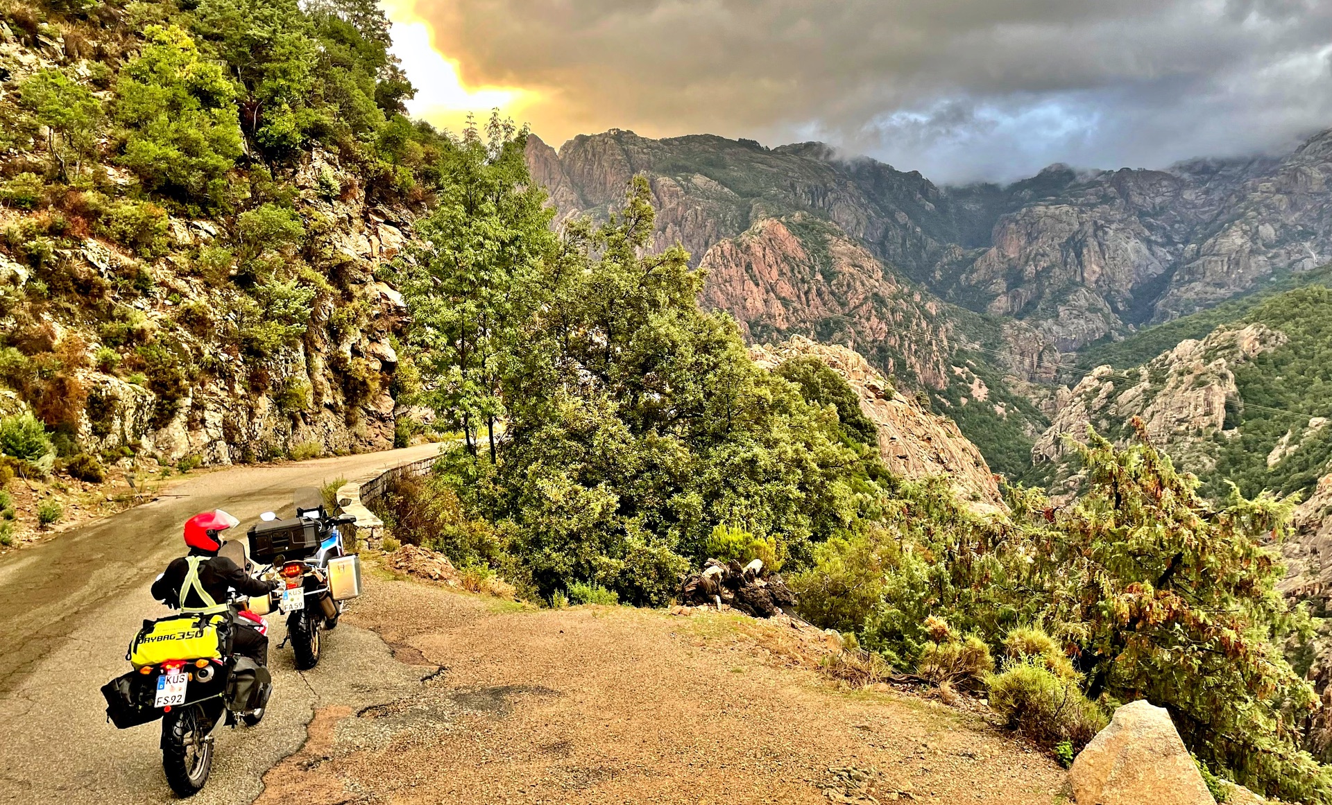 Der lange Ritt von Ghisonaccia über Monte Cinto zum Golf von Porto war im übelsten Unwetter. Alles voll Geröll und helmgroße Wacken in jeder Kurve. Einen solchen Regen hatten wir noch nie erlebt. Und wir hatten schon so manche Regenfahrt...